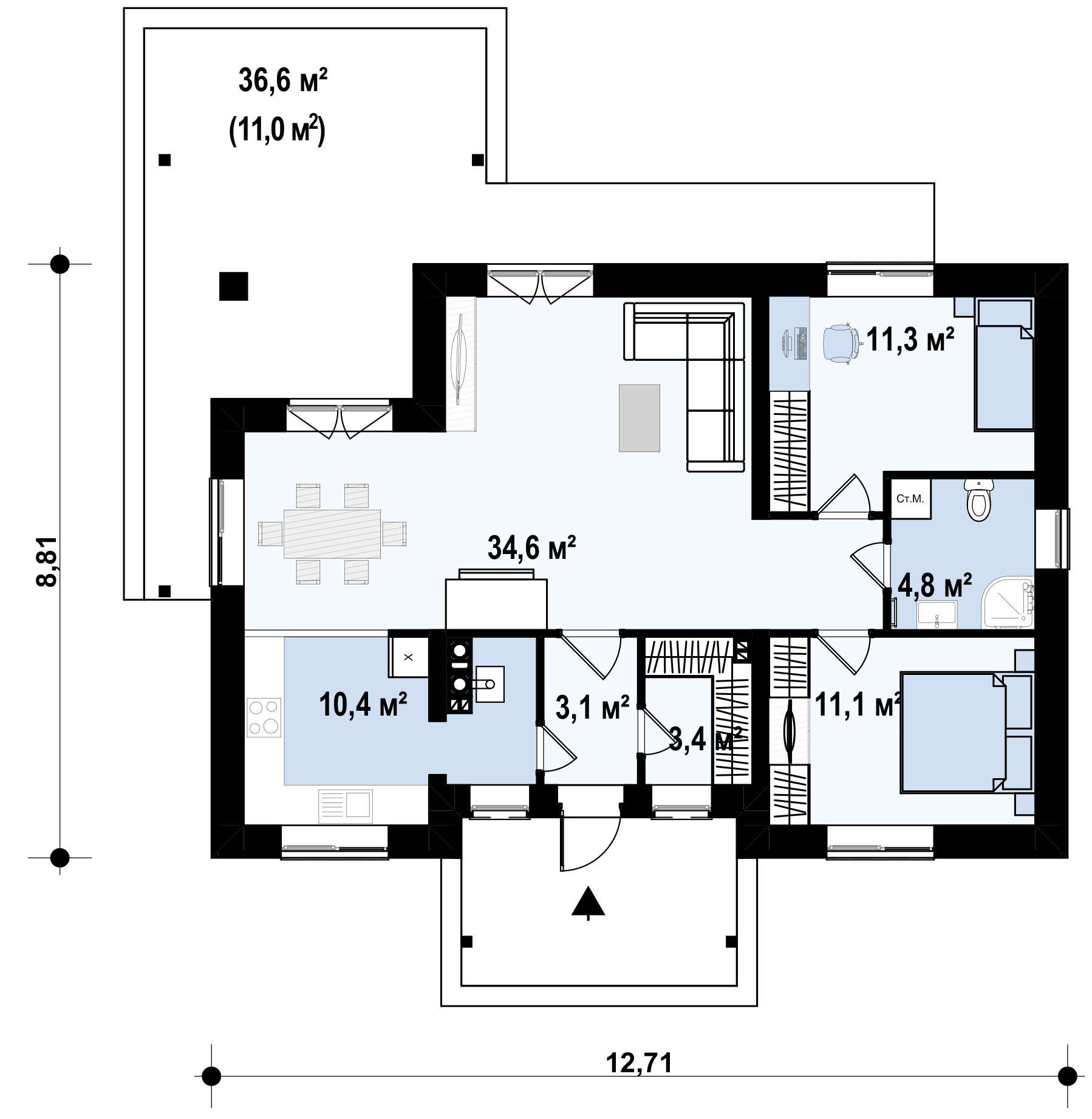 Индивидуальные проекты одноэтажного дома с 2 спальнями и гостиной подойдут, если стандартные не способны обеспечить желаемую функциональность или хочется реализовать творческий потенциал. Поделитесь своим видением концепции, мы разработаем проект. Также можно предоставить готовый план, специалисты Днипробуд адаптируют его под характеристики вашего объекта, особенности участка.