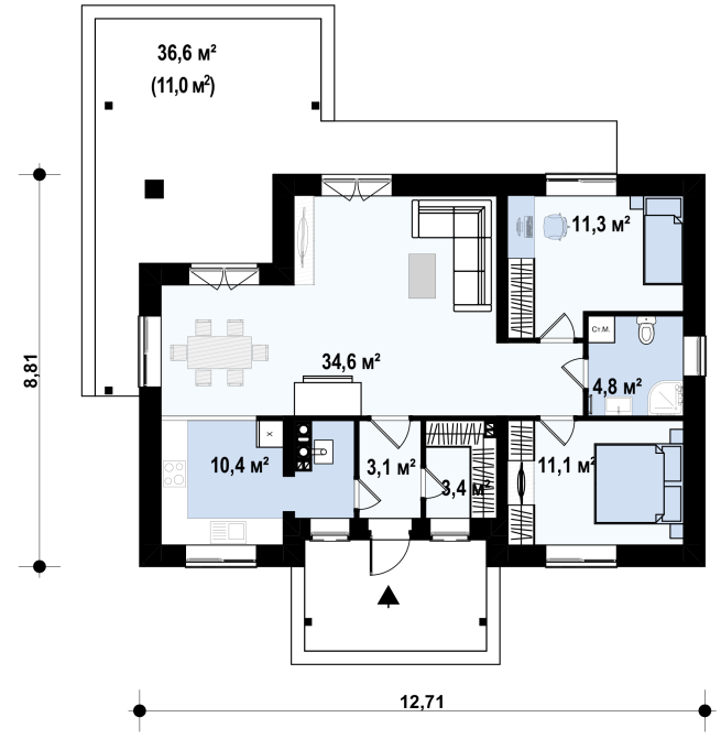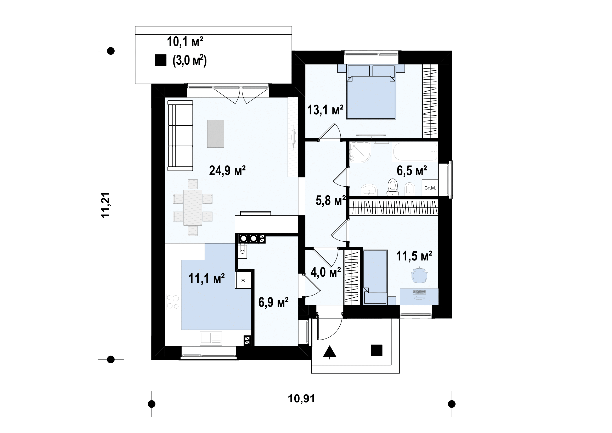 Отдельно нужно предусмотреть размещение хозяйственных объектов. Их следует планировать, соблюдая технику безопасности, используя разрешенные технологии. Мы можем предложить практичный проект одноэтажного дома с 2 спальнями и котельной по стандартам ДСТУ. Спланируем разводку инженерных коммуникаций, подберем материалы.