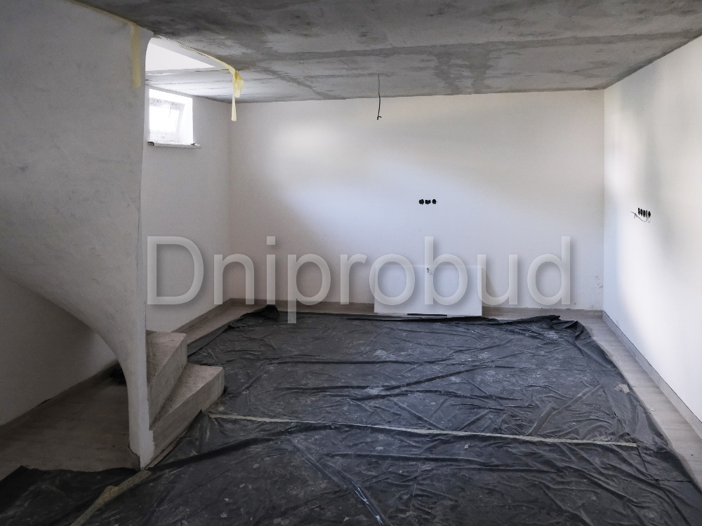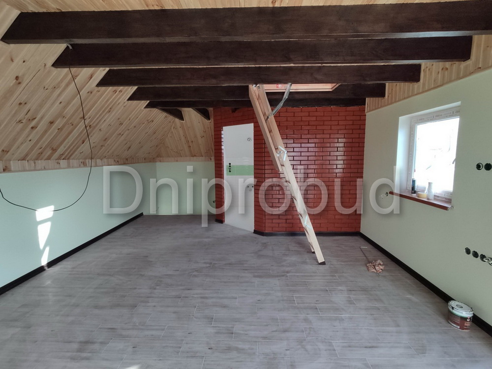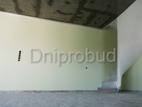 В доме на первом этаже оборудована кухня/гостиная. На втором – санузел, спальня. На третьем этаже находится зона отдыха с возможностью подъема на чердак по откидной лестнице. Отделка потолка третьего этажа и чердака – деревянная. Обустроенный потолок – лакировка бетонной поверхности. Электрические провода разводились по потолку. На участке кроме этого дома находится: одноэтажный жилой дом площадью 80 кв.м., гараж на две машины площадью 35 кв.м.