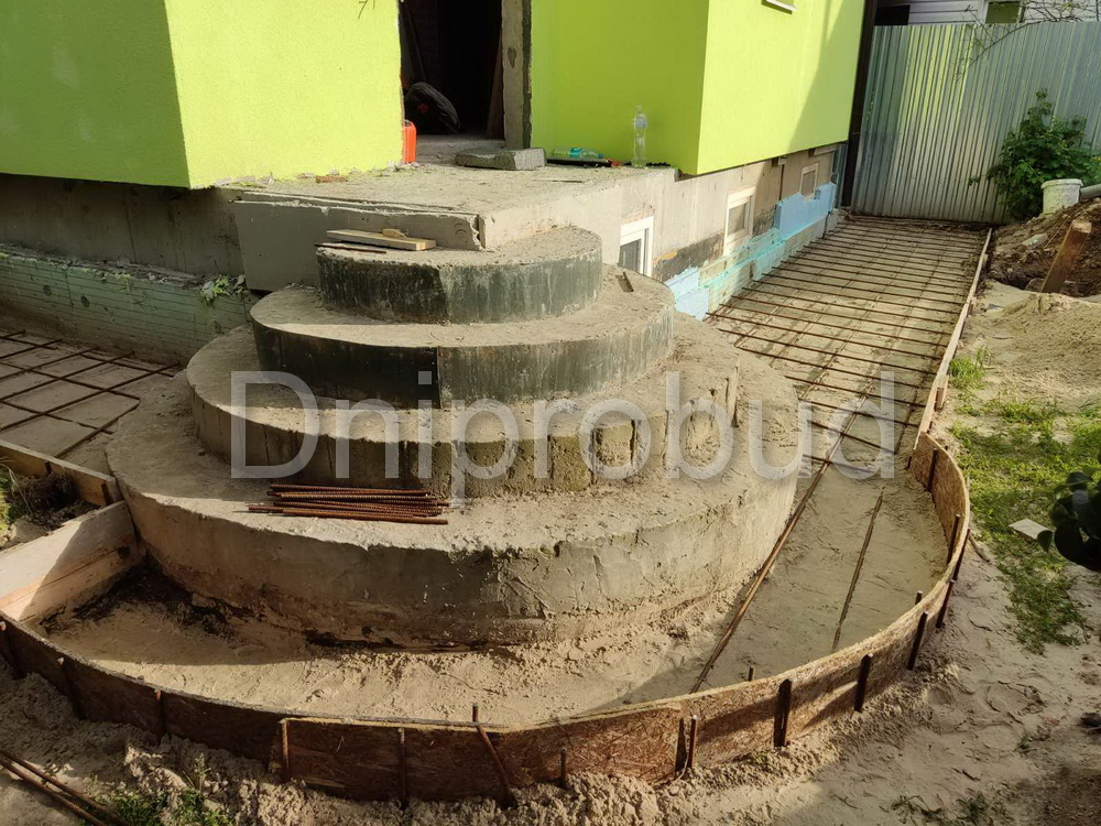 Размер дома 4,5 м*7 м, что не давало возможности обустроить стандартные лестничные клетки между этажами. Поэтому они заняли площадь этажа всего лишь 4 кв.м. Все ступеньки забежные, армированные железобетонные.