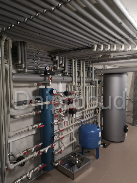 - Отопление: газовый котел, электрический котел, тепловой насос. Специалистами компании Днипробуд был максимально использован потенциал участка для электроснабжения, а именно: установлен тепловой насос «вода-вода» с «подключением» к р. Днепр.