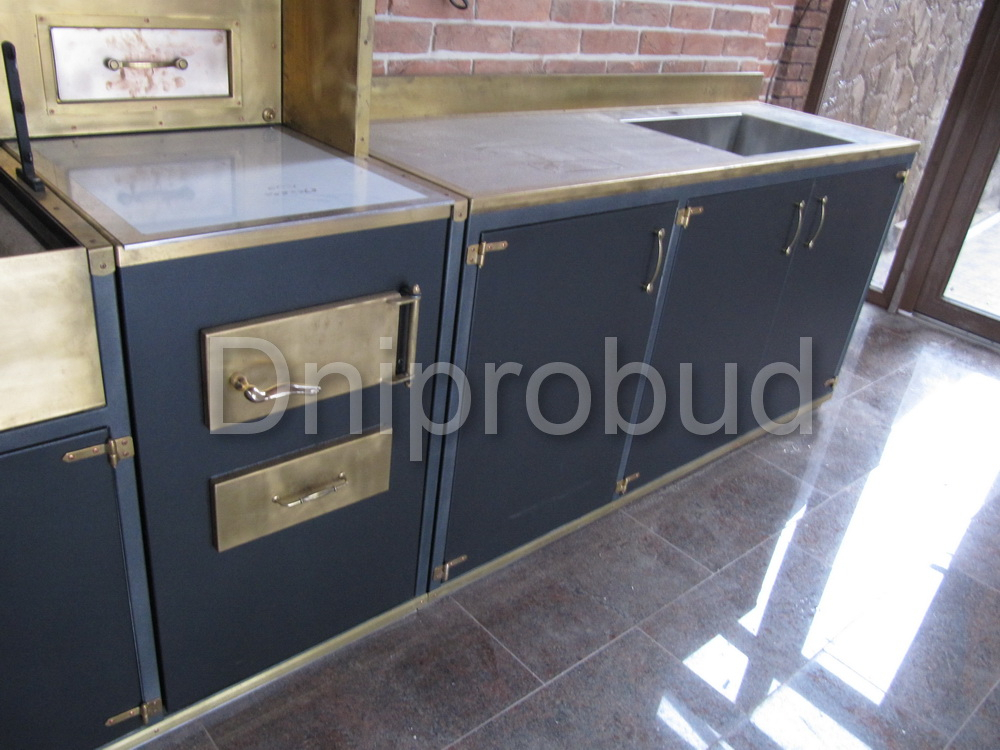 Слева от коттеджа специалистами компании Днипробуд был пристроен гараж для водного транспорта и, с помощью монолитного железобетонного перекрытия, большая крытая терраса с раздвижной системой дверей и большим медным барбекю.