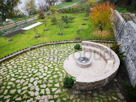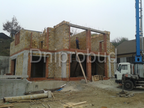- Стены: каркас из бетонных колонн + ракушечник толщиной 400 мм + каменная вата 100 мм + керамический кирпич ручной формовки. Отделка цоколя: гранит. Цокольное помещение: винный погреб и котельная.