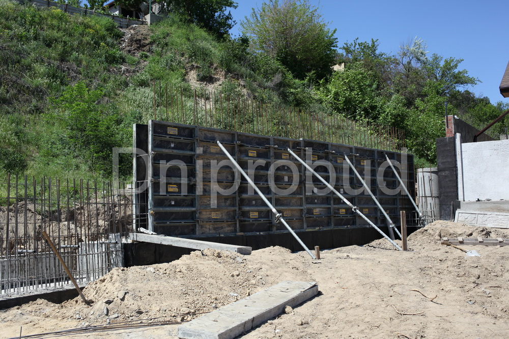 Участок расположен под высотой, которая сползает вниз. Демонтаж старых "укреплений склона". Фундамент стоит на гранитной плите (глубина залегания 0,5-2 м). Возведена массивная подпорная стена с дренажем и системой водоотведения.
