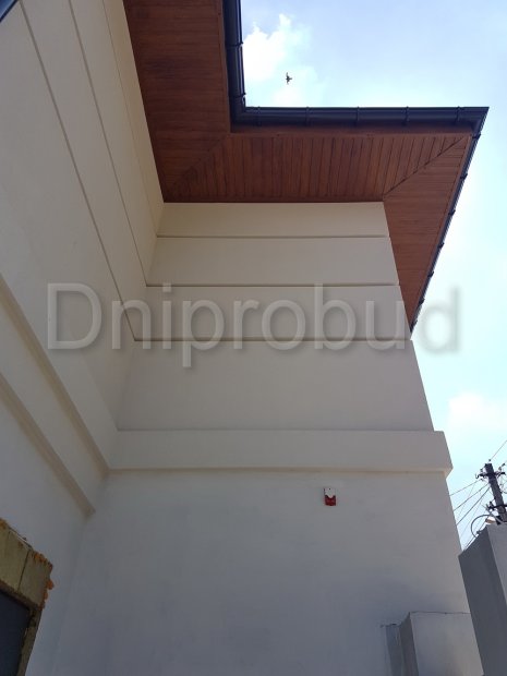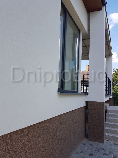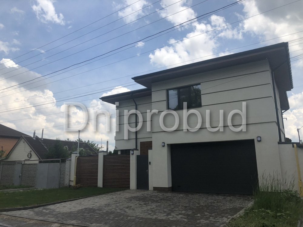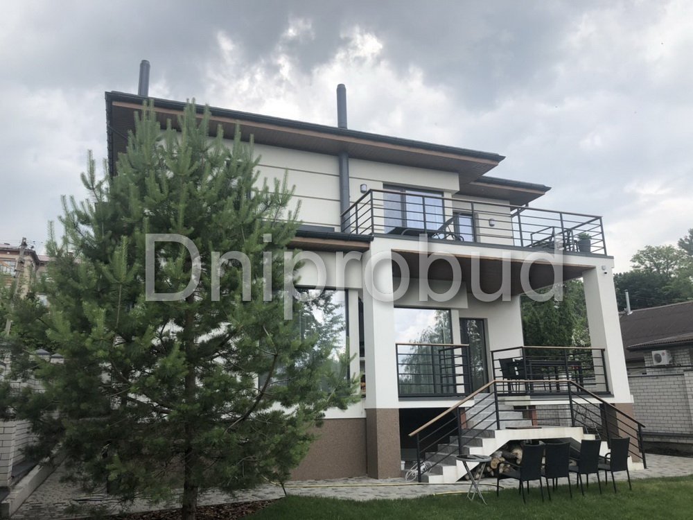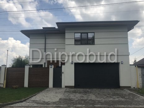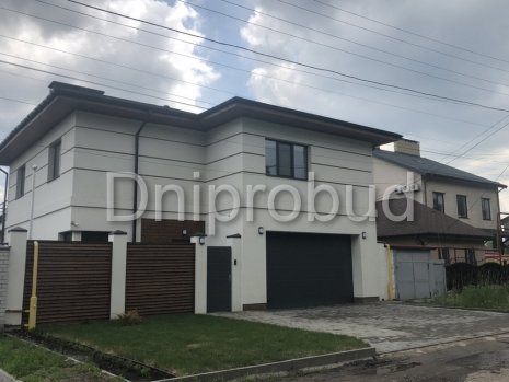 Большой современный дом с цокольным этажом, расположенный в Днепре. Строительство велось в районе плотной городской застройки на улице Сечевых Стрельцов по проекту DB 3.