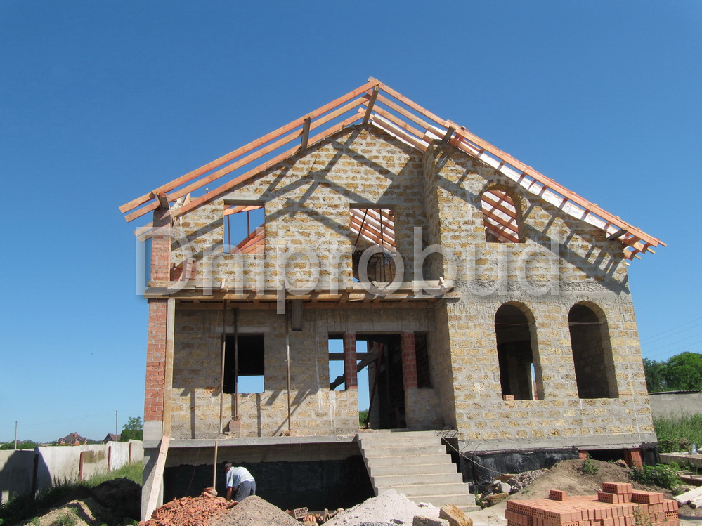 - Стены из ракушечника (ракушняк) 400 мм + 100 мм пенополистирола и декоративная штукатурка (утепленные стены и цоколь).