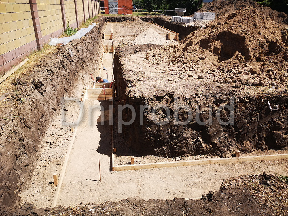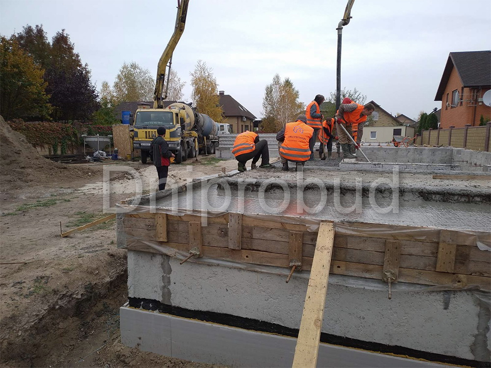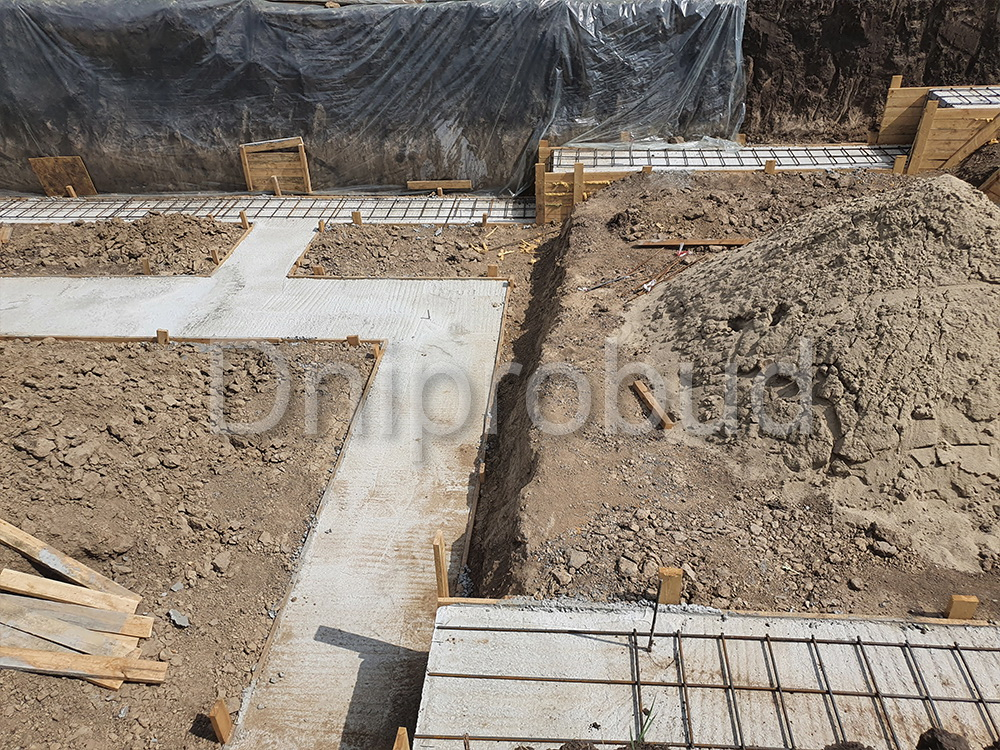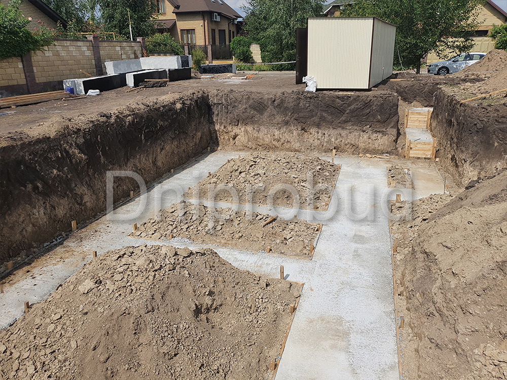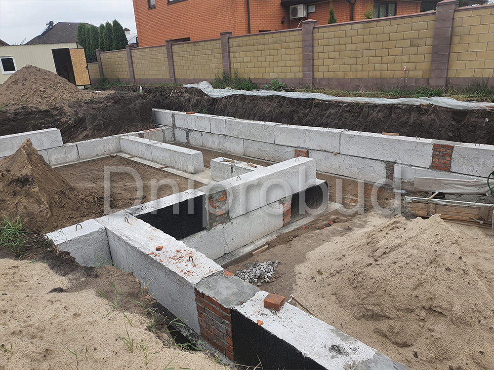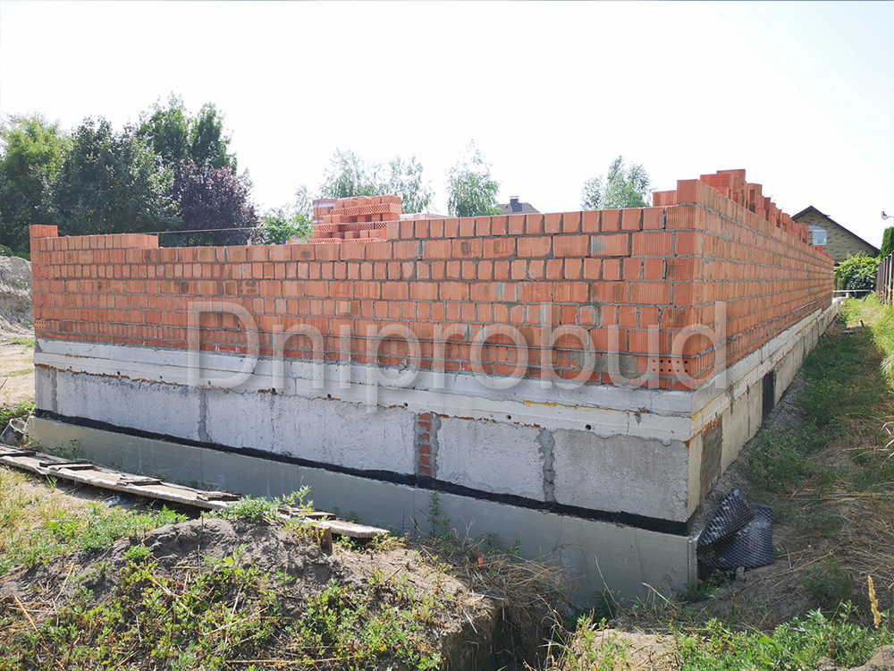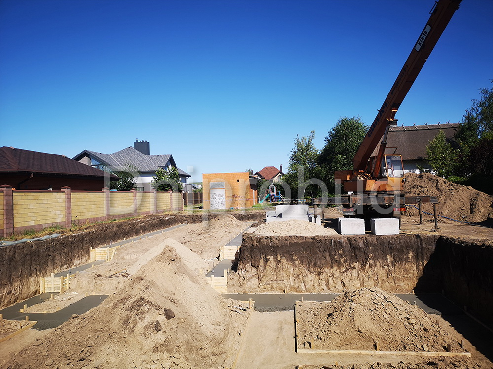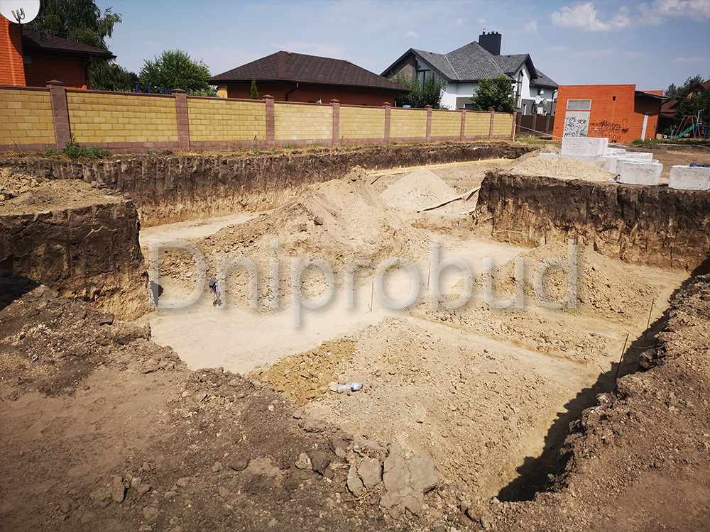 - Устройство цокольного этажа. Участок строительства имеет перепад по высоте всего 0,3м, в пятне застройки дома, поэтому устройство цокольного этажа предполагает большое количество земляных работ. В цокольном этаже дома располагается просторная мастерская, а также технические помещения: топочная, постирочная, помещение для хранения инвентаря. Вход в цокольный этаж осуществляется двумя способами: 1-й - по внутренней лестнице, 2-й - отдельный вход с улицы предусмотренный с левой стороны дома.