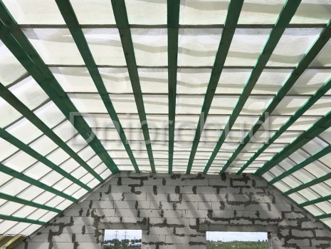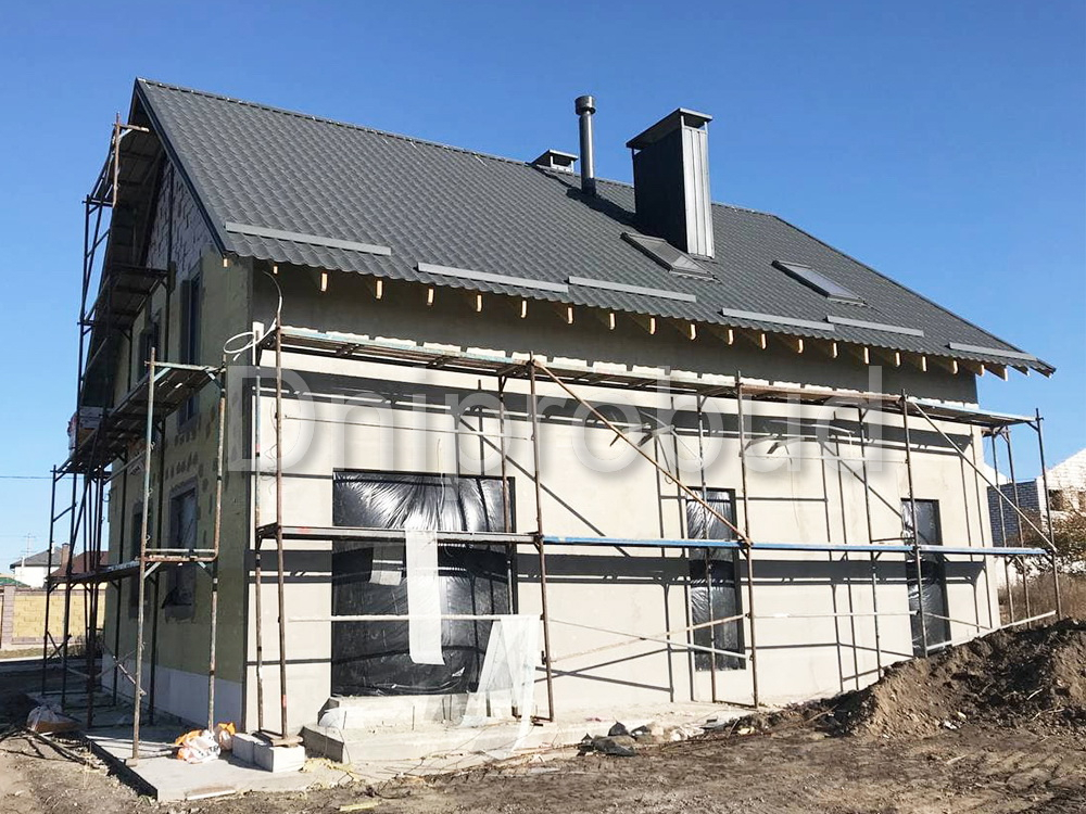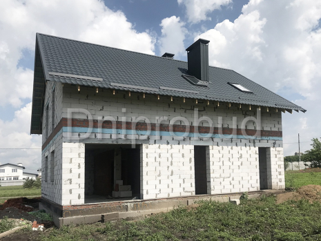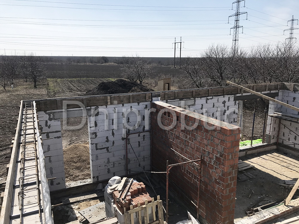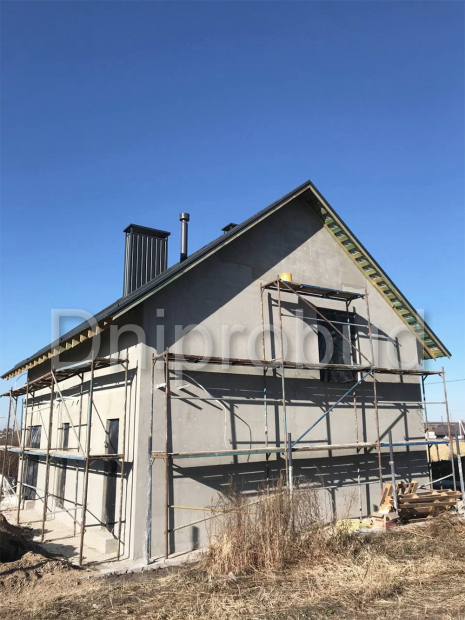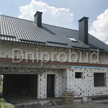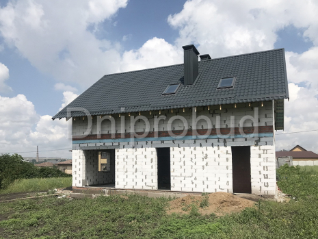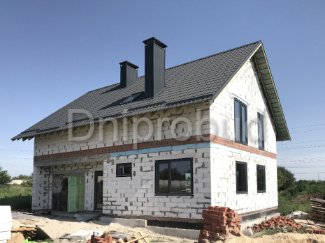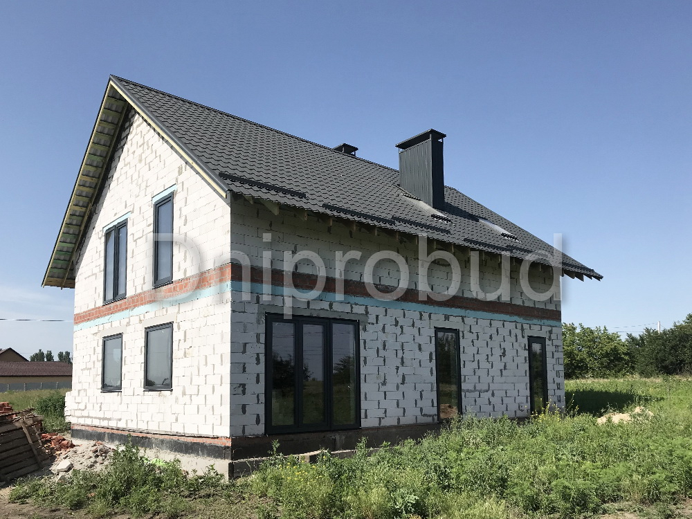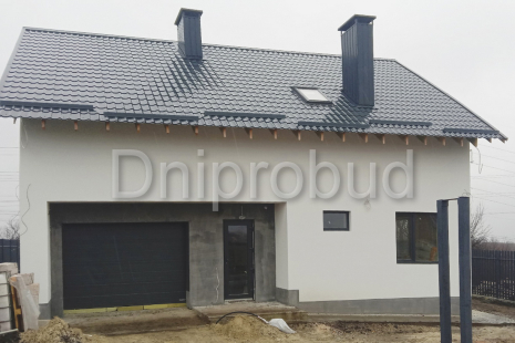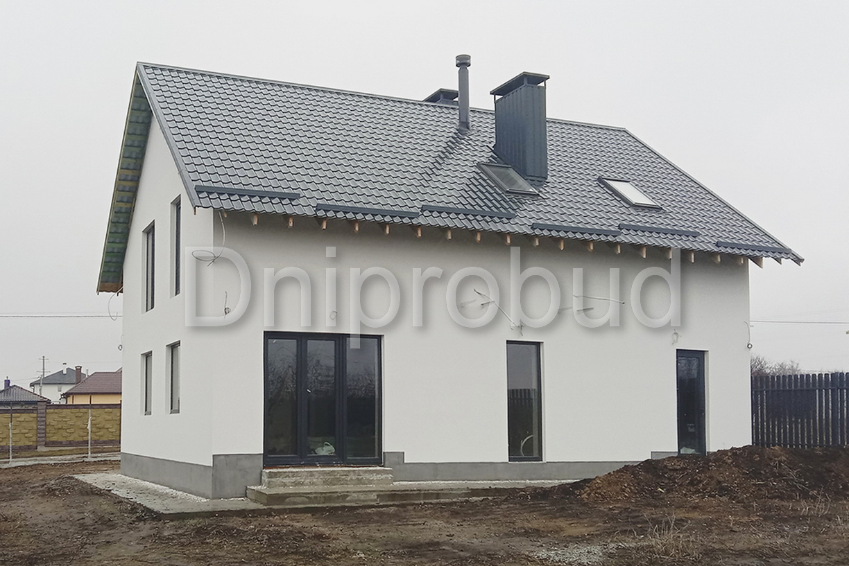 Мансардный дом в с. Дослидное, Днепропетровской области в районе новостроек. Земельный участок площадью 12 соток прямоугольной формы находится на плато, что позволяет существенно экономить на фундаментных работах и устройстве ограждения. Этот объект реализован по проекту U183 от компании Z500. По желанию заказчиков внутреннее оформление дома было выполнено по принципу минимализма и с использованием качественных, но простых материалов. Это позволило существенно сэкономить бюджет строительства и выйти на стоимость квадратного метра под ключ в 800 $.