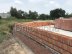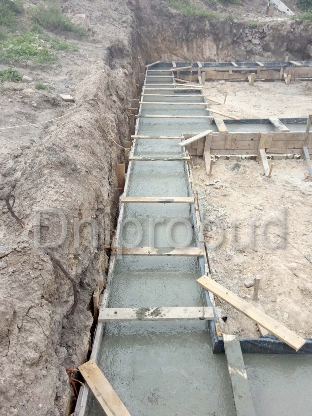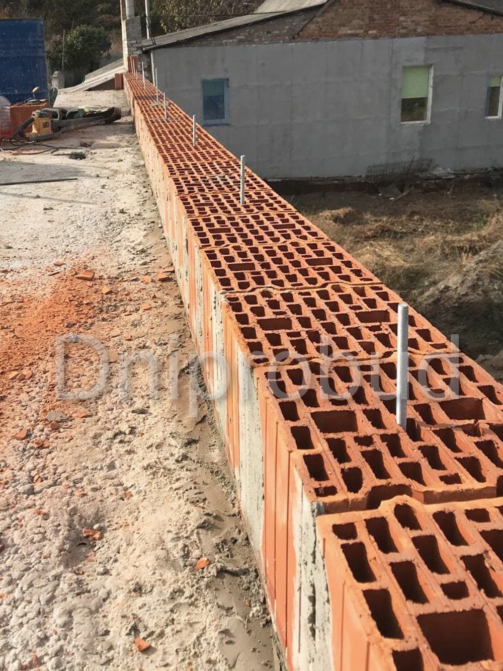 Особенностью данного проекта является расположение соседнего участка на значительно более высоком уровне по сравнению с местом строительства. Это вызвало необходимость возведения массивной подпорной стены, которая одновременно служит цоколем будущего ограждения участка.