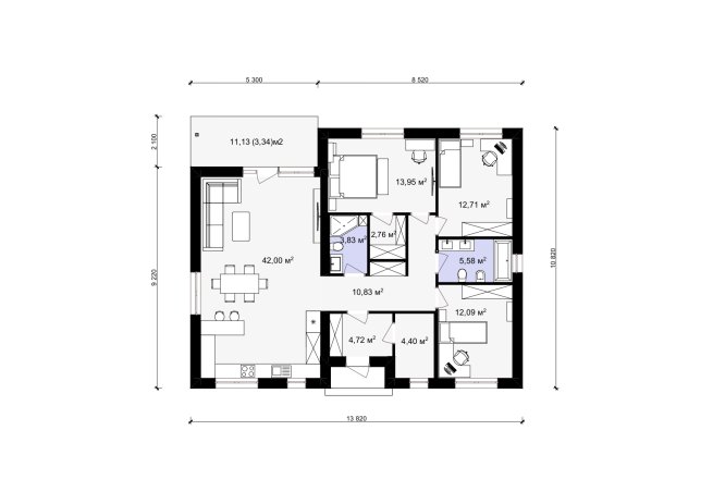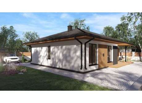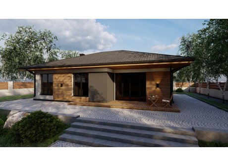 Проект одноэтажного дома DB12V1 от DNIPROBUD представляет собой открытую планировку, где кухня и гостиная объединены в одну зону.