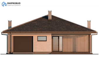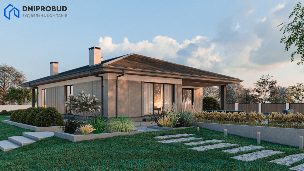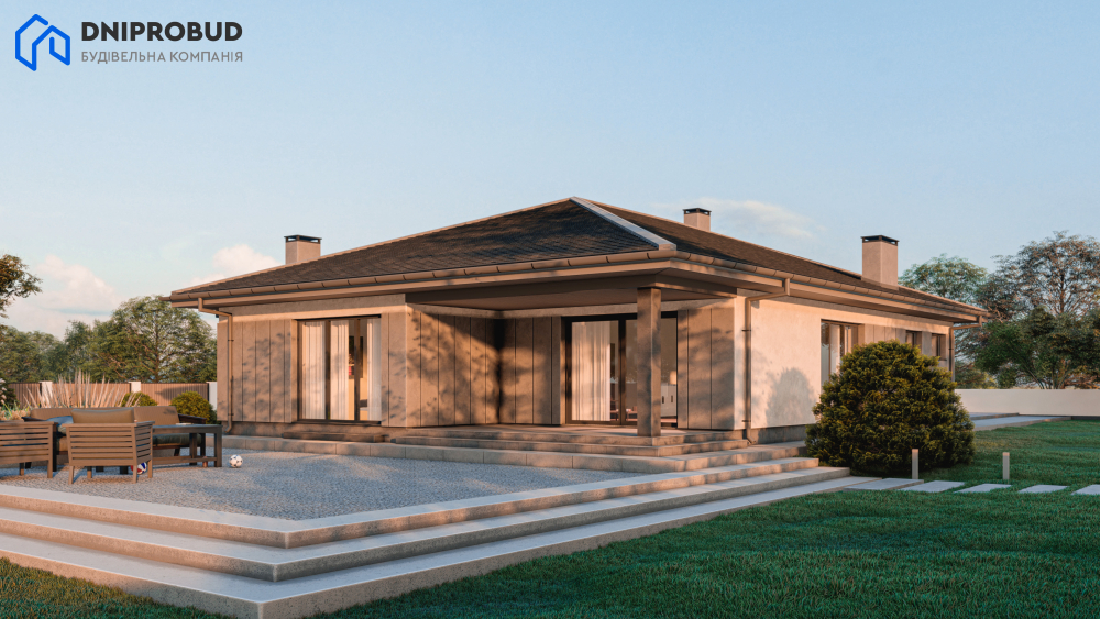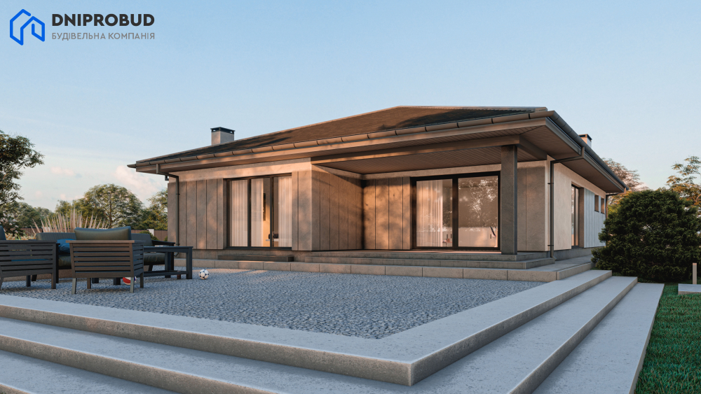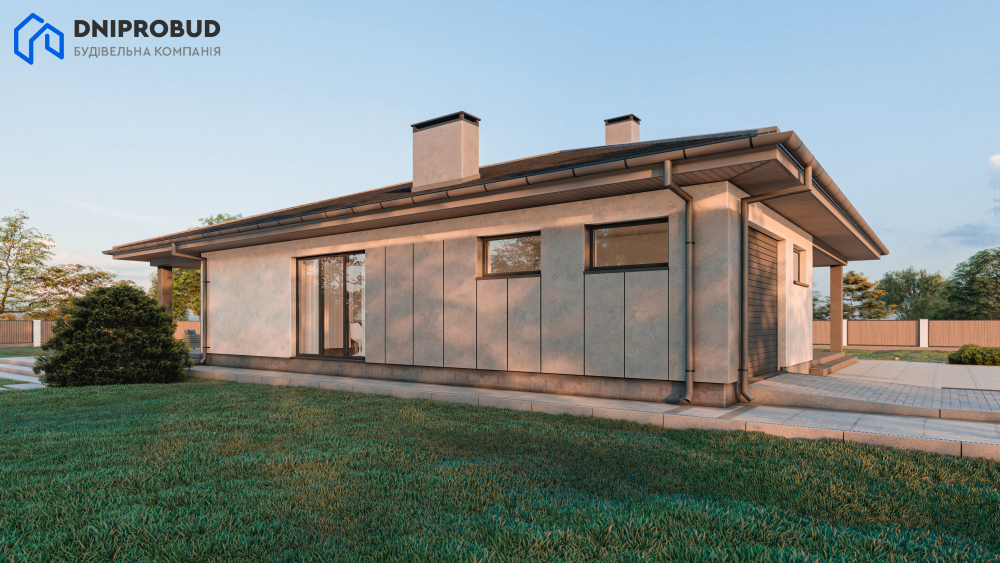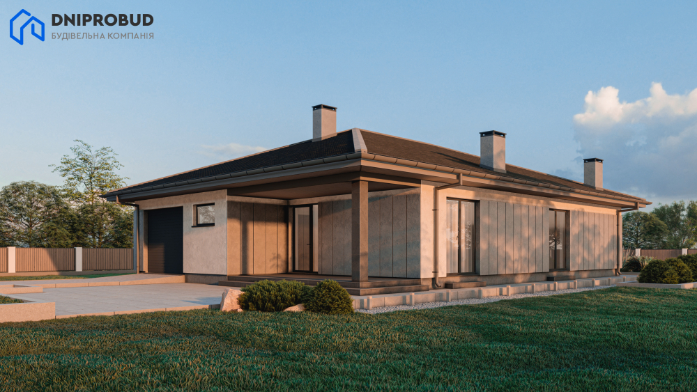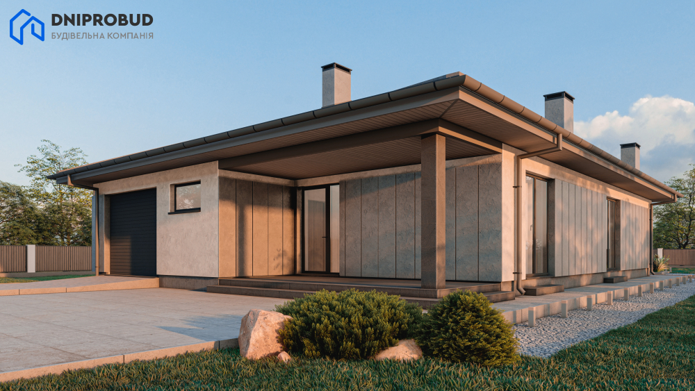 Современный одноэтажный дом с лаконичными формами и гармоничным сочетанием натуральных оттенков фасада. Облицовка выполнена в светло-серой гамме с вертикальными декоративными панелями, дополнена темными контрастными элементами крыши и окон. Просторная крытая терраса с двух сторон дома создает уютные зоны для отдыха. Большие панорамные окна обеспечивают максимальное естественное освещение и открывают вид на двор. Входная группа и зона патио оформлены широкой лестницей, подчеркивающей монументальность и удобство планировки. Предусмотрен встроенный гараж на одно авто.