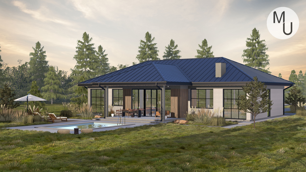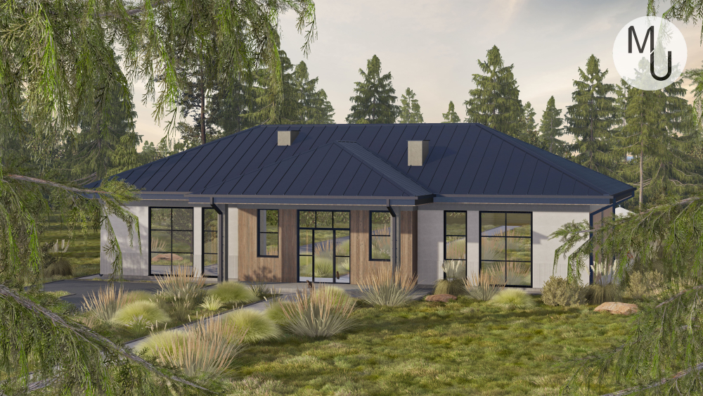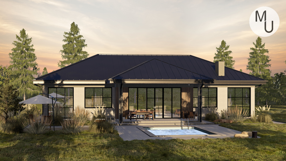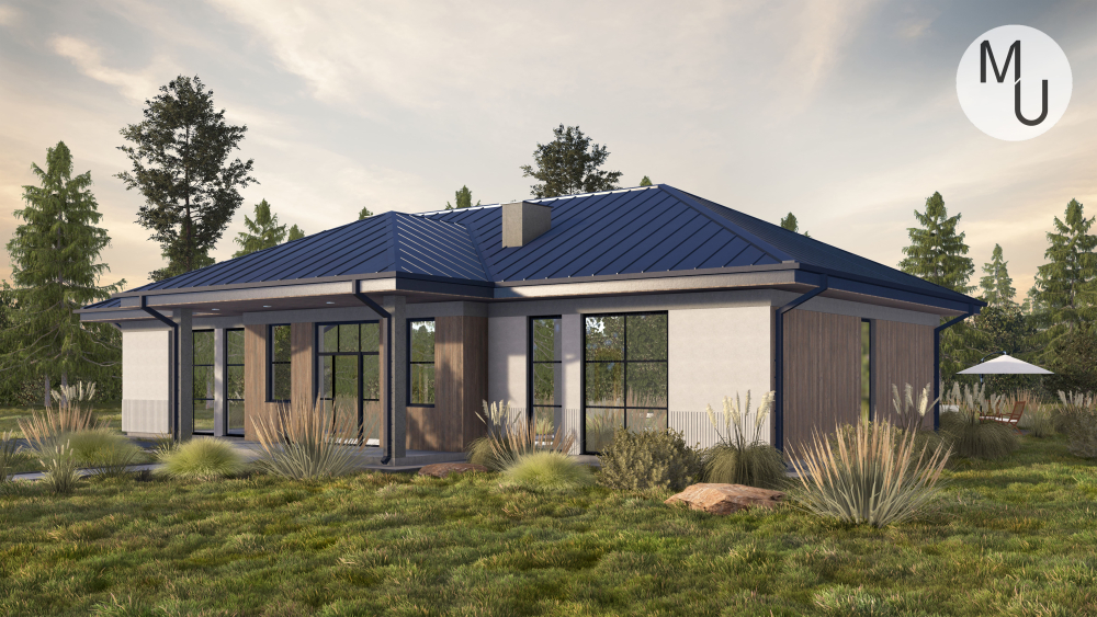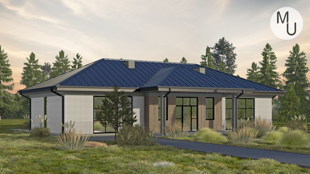 Современный одноэтажный проект для семьи из 4–6 человек, ценящей пространство и функциональность. Его архитектура сочетает строгие формы с натуральными материалами — фальцевой крышей, деревянными акцентами и большой площадью остекления. Благодаря этому дом гармонично вписывается в природное окружение.