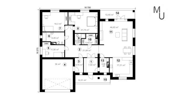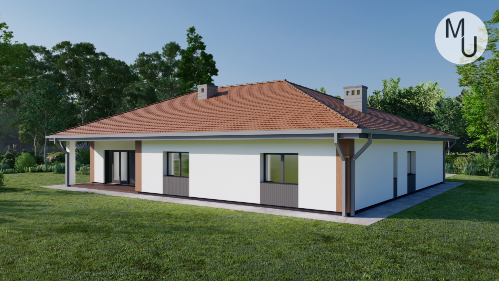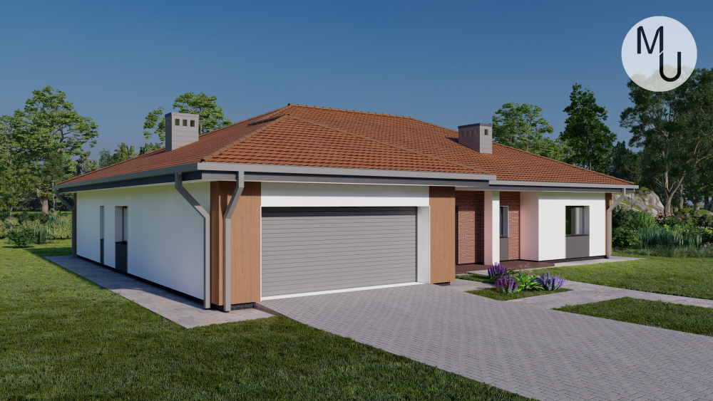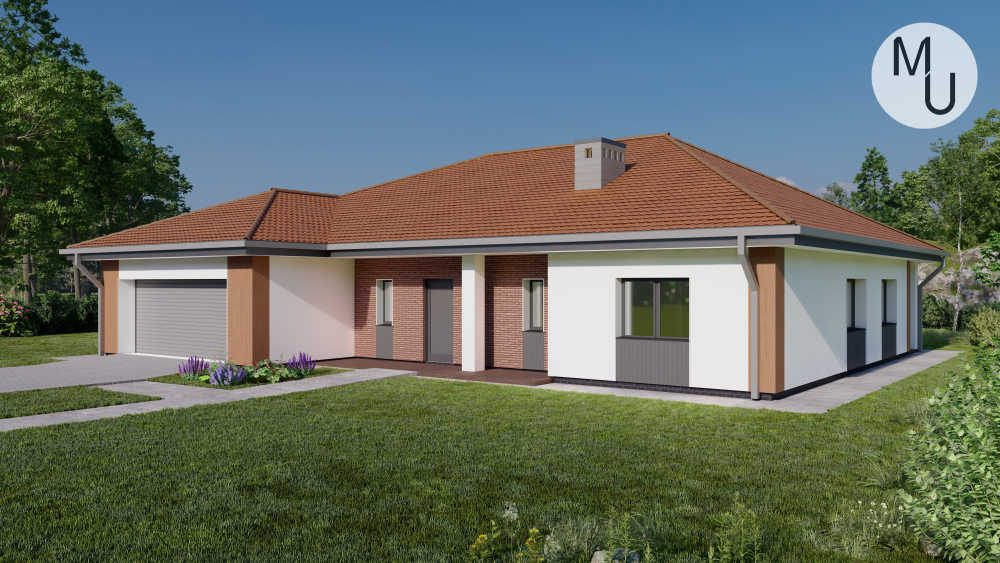 Современный одноэтажный дом, объединяющий удобство и стиль. Это делает его идеальным решением для домашнего жилья. Фасады дома выполнены в сочетании белой штукатурки, декоративных вставок из дерева и облицовочного кирпича. Это создает привлекательный и уютный вид. Крыша дома многоскатная, покрыта коричневой черепицей, гармонично сочетающейся с фасадами. Этот проект идеально подходит для современной семьи, ценящей комфорт, практичность и функциональность.