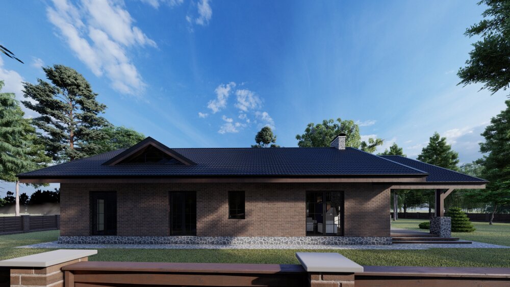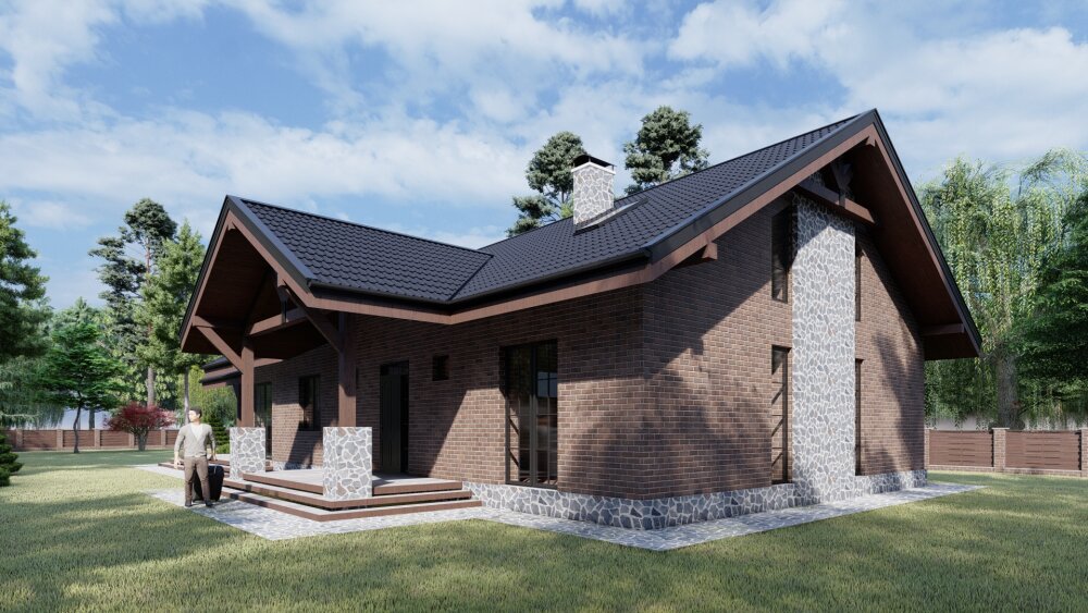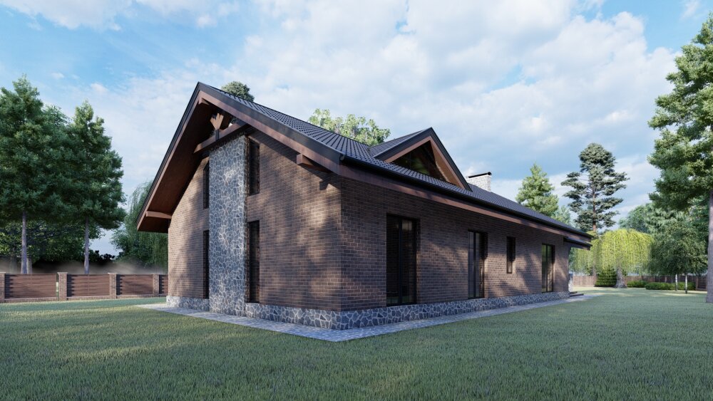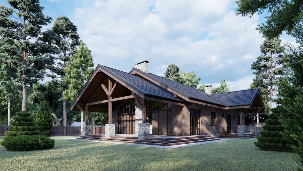 Одноэтажный дом в стиле современного шале с акцентом на натуральные материалы: фасад из кирпича, цоколь и опоры террас облицованы диким камнем, открыты деревянные стропила и фермы. Большие витражи обеспечивают максимальное естественное освещение и соединяют интерьер с садом. Предусмотрены две крытые террасы: главная при гостиной и уютная боковая – для летней кухни/барбекю.