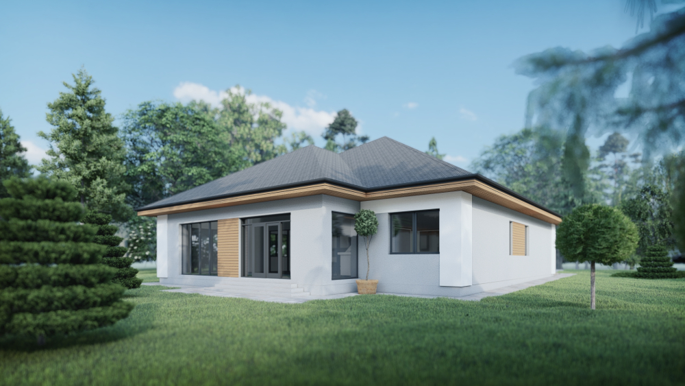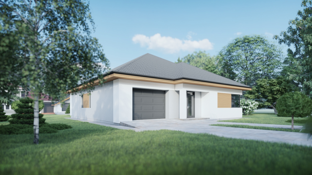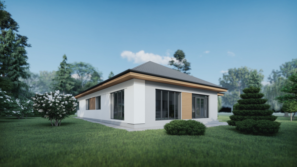 Компактный современный одноэтажный дом с плоской крышей в стиле «модерн-сканди». Светлые фасады со вставками из деревянных панелей, панорамные окна, прямоугольная геометрия и функциональная планировка. Просторная гостиная, совмещенная со столовой, имеет выход на террасу. Есть три полноценные спальни, два санузла, кладовку и встроенный гараж. Идеальный вариант для семьи, ценящей пространство, практичность и минималистичную эстетику.