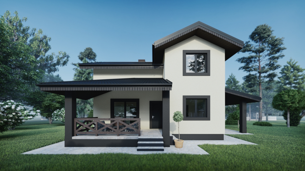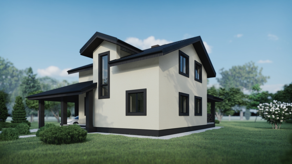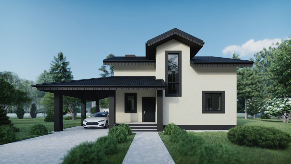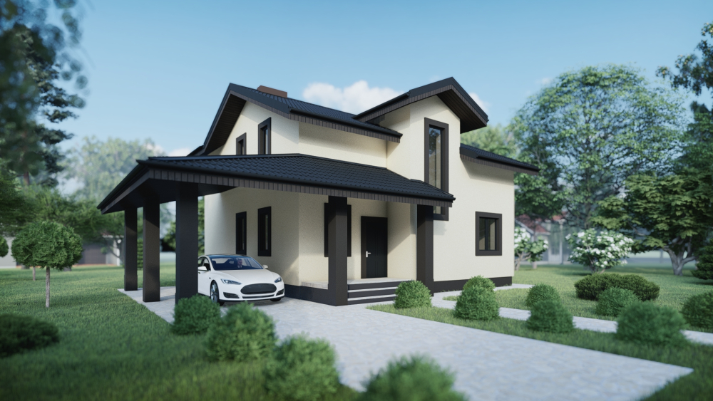 Двухэтажный коттедж в современном стиле с контрастным оформлением. Фасад кремового цвета, что эффектно сочетается с насыщенными темно-серыми элементами: крышей, цоколем, обрамлением окон и опорными колоннами. Дом имеет крытую входную зону с небольшой террасой и деревянным ограждением, а также функциональный навес для автомобиля, являющийся продолжением крыши. Многоскатная крыша добавляет архитектурной выразительности.
