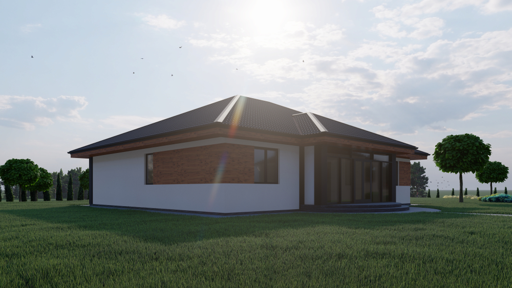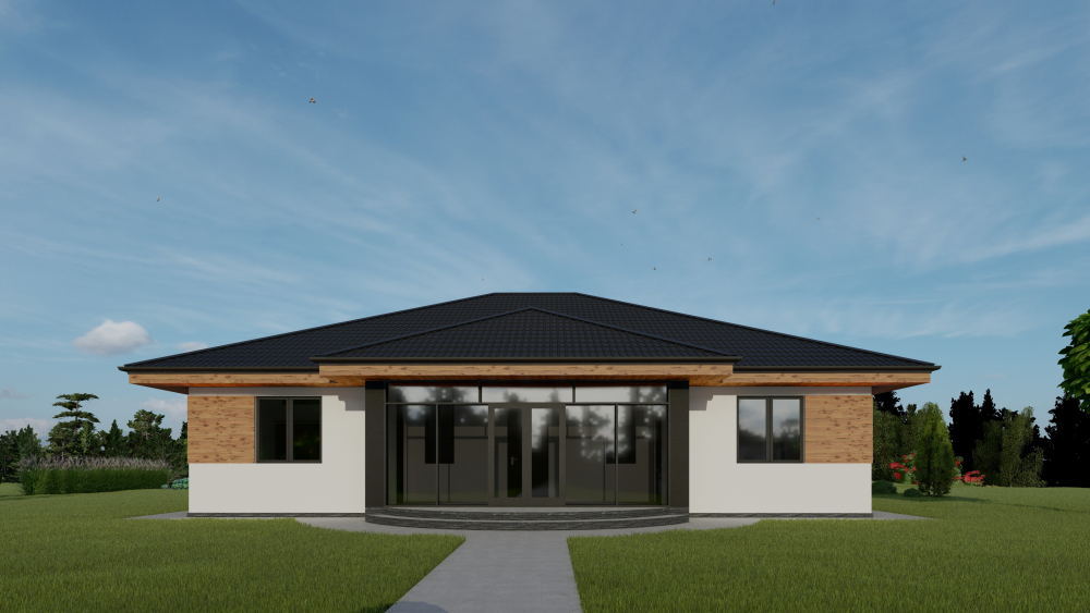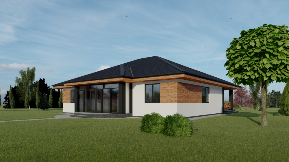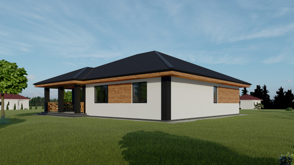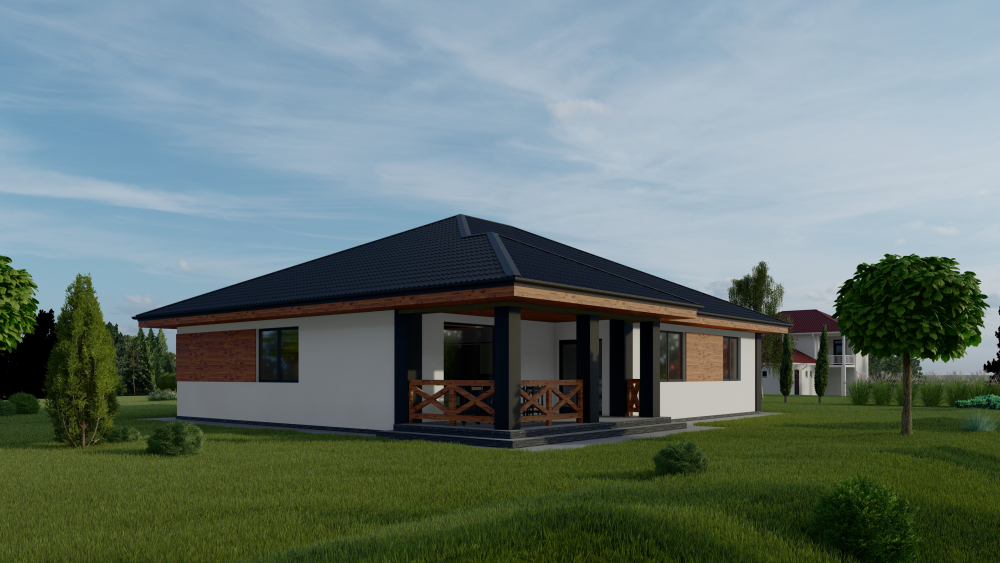 Компактный одноэтажный коттедж в современном стиле с элементами «сканди-шале»: сочетание светлой фасадной штукатурки, контрастных темных акцентов и деревянной отделки. Уютная крытая терраса с деревянными изгородями создает идеальное место для летнего отдыха. Большие окна обеспечивают максимальную инсоляцию помещений, а продуманная планировка позволяет комфортно разместить семью из 3-4 человек.