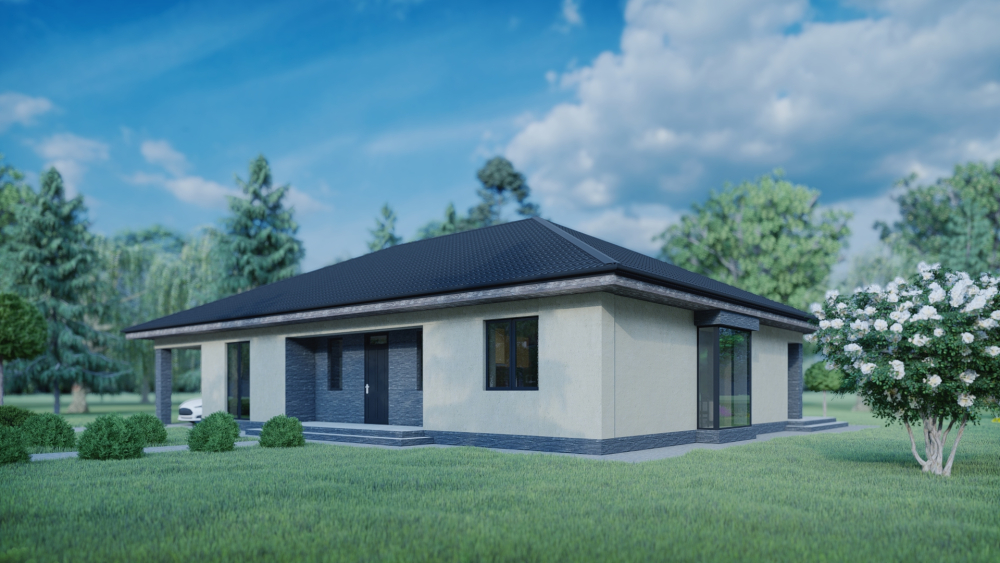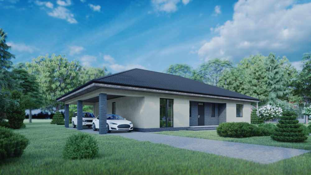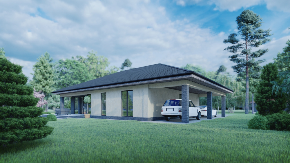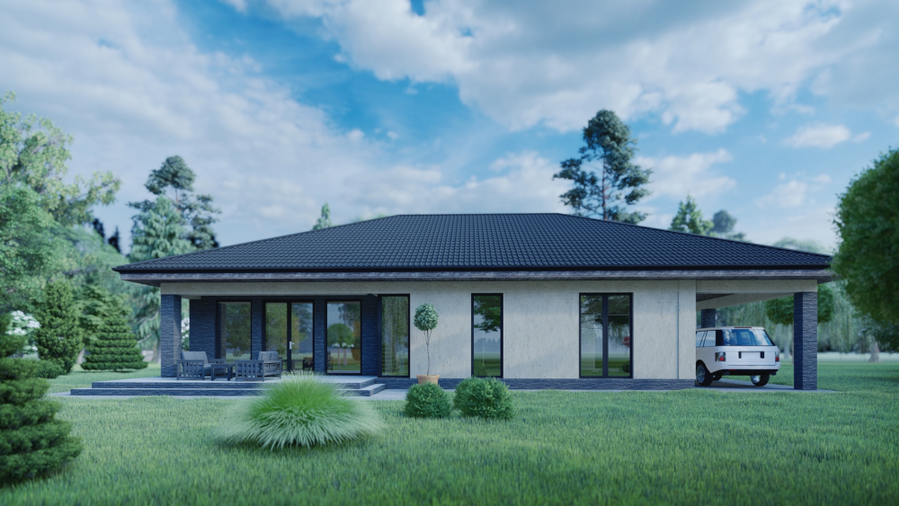 Современный одноэтажный дом с четырехскатной крышей и навесом на два автомобиля. Лаконичная архитектура объединяет светлые стены с декоративной темной облицовкой вокруг входов и окон, а также контрастной кровлей. Панорамные окна и выход на просторную крытую террасу создают ощущение открытости и связи с природой.