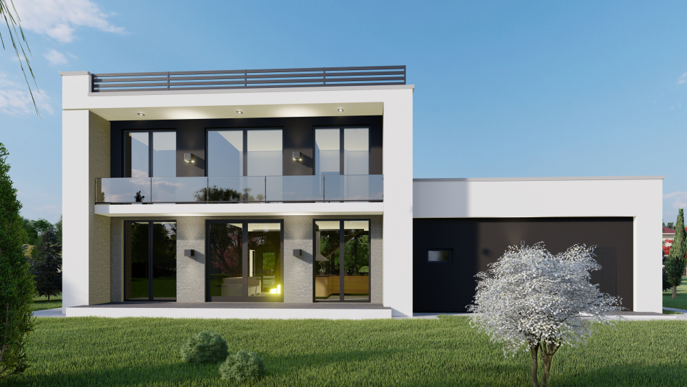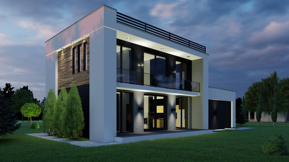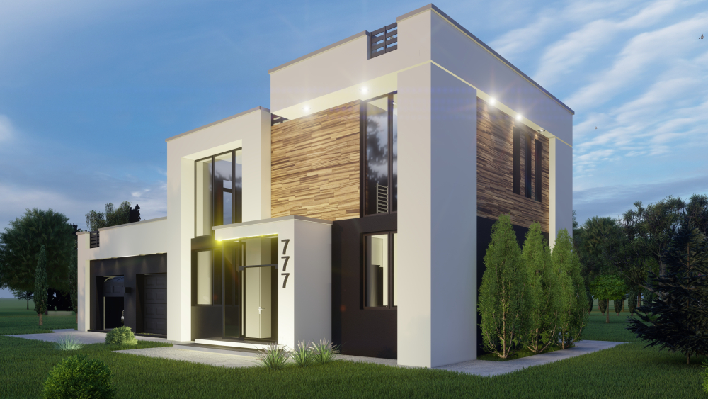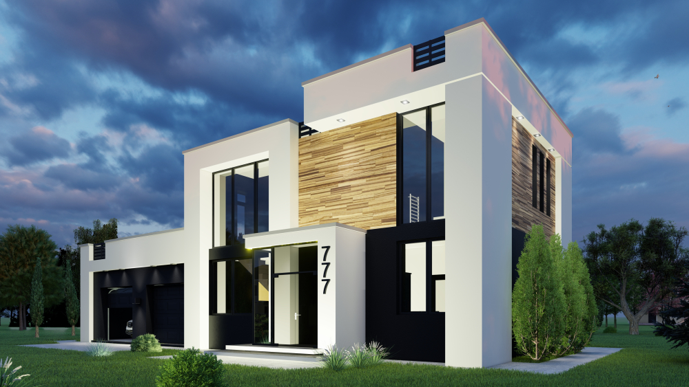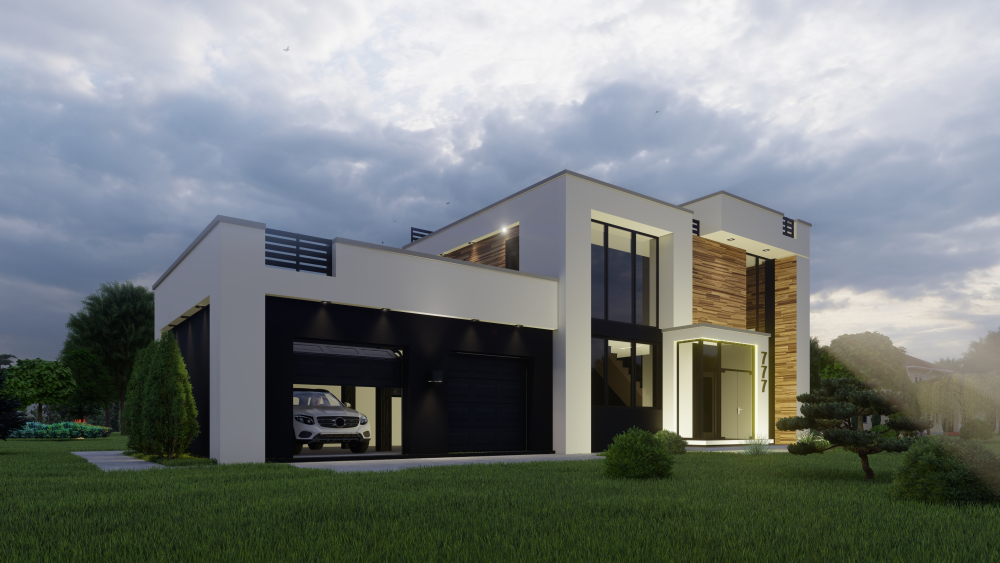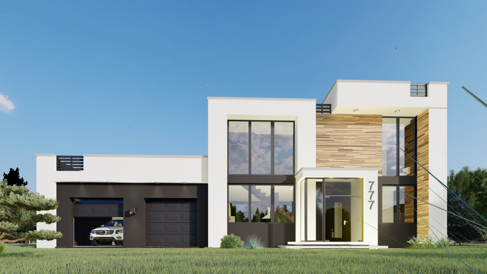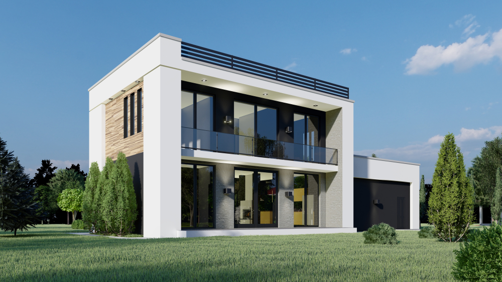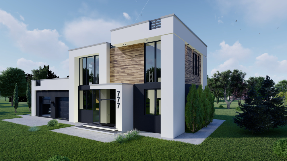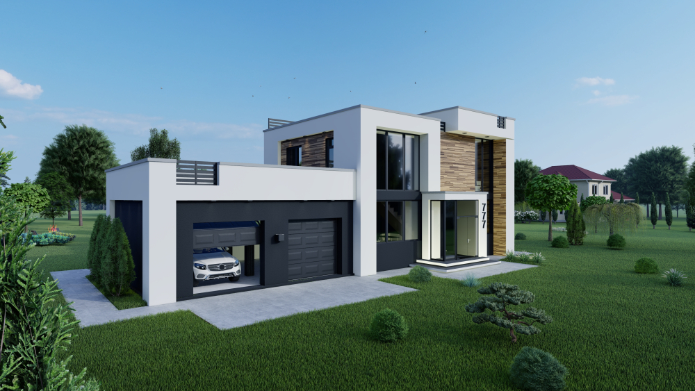 Современный двухэтажный дом с акцентом на контрастной геометрии. Фасады отделаны комбинацией белой и тёмно-серой штукатурки с большими вставками из горизонтального деревянного планкена. Дом имеет панорамное остекление, особенно в зоне входа и гостиной. Присутствует открытый балкон на втором этаже с прозрачным стеклянным ограждением и интегрированный гараж на две машины с плоской крышей.
