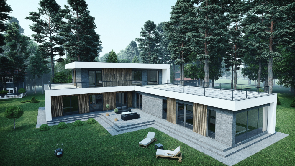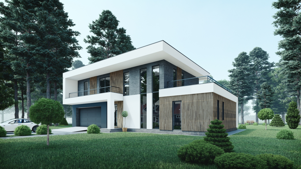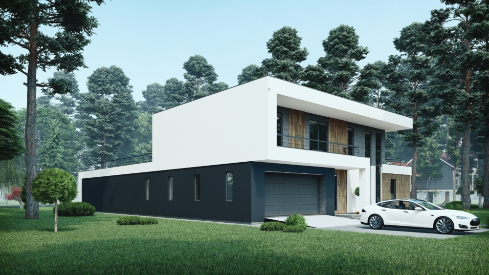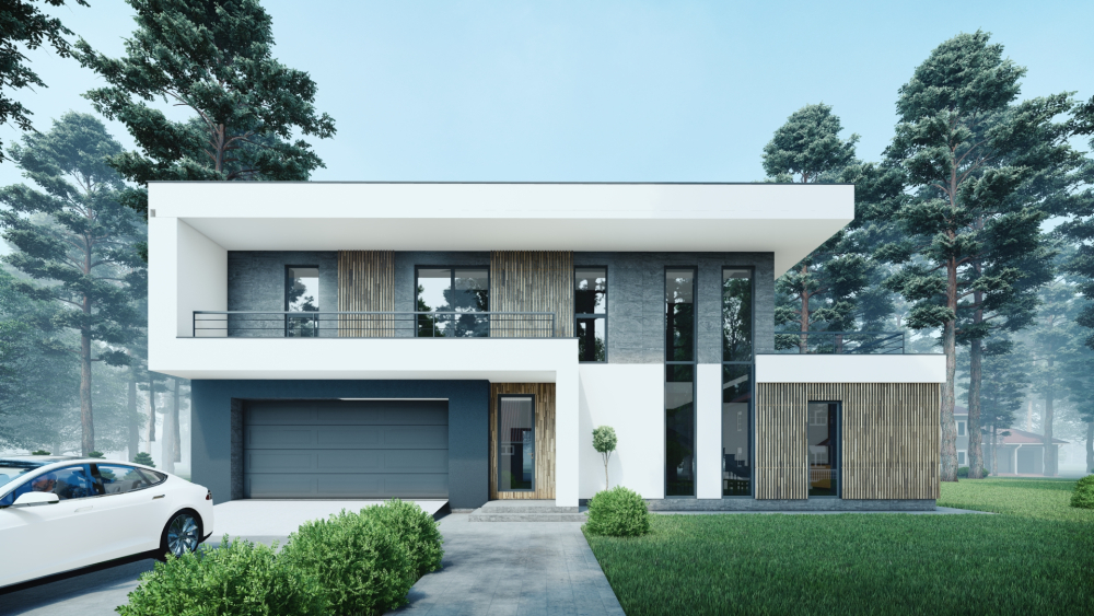 Современный и просторный двухэтажный коттедж, выполненный в минималистичном стиле с контрастной и текстурной отделкой. Фасады сочетают белую штукатурку, облицовку под тёмный камень и вертикальные деревянные ламели, добавляющие естественности. Дом имеет панорамное остекление и плоскую крышу с металлическим ограждением, которая используется как терраса. На первом этаже расположен гараж на 2 машины.