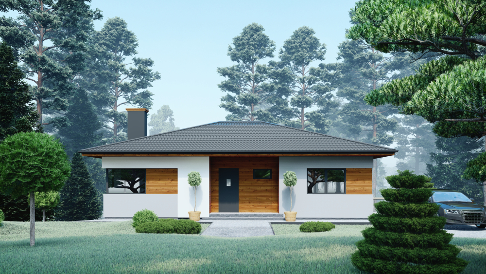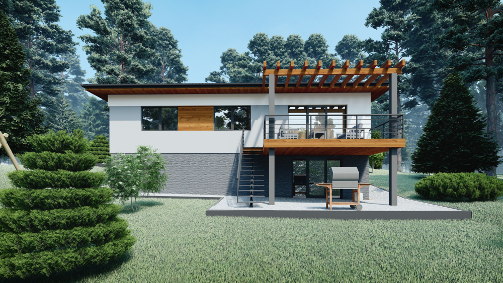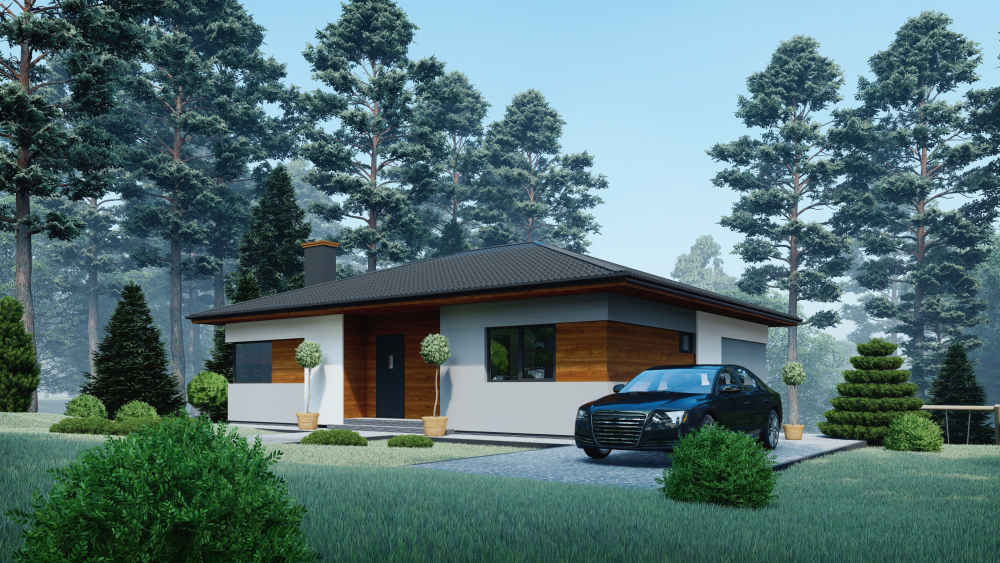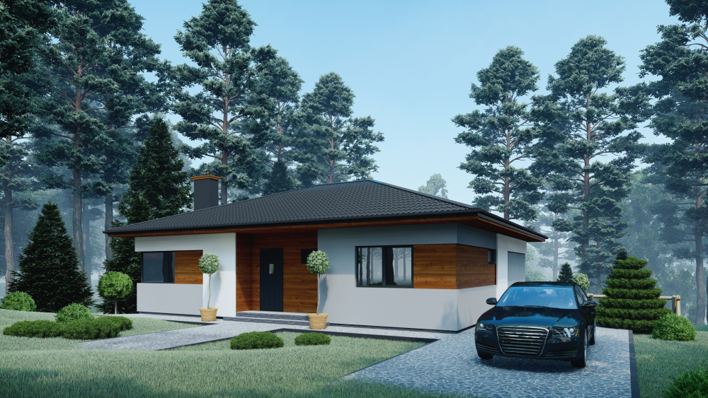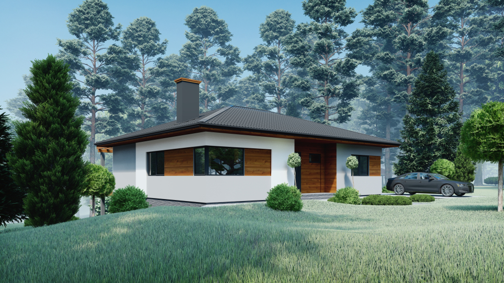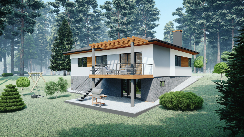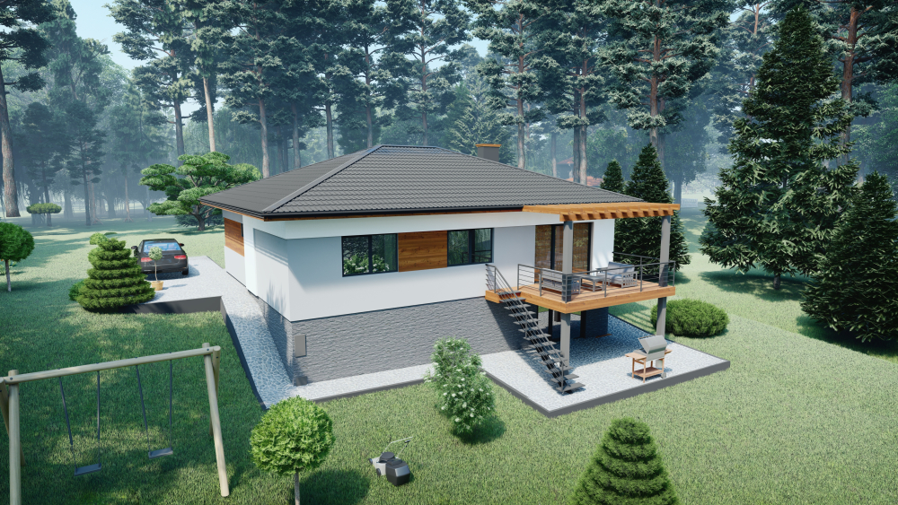 Компактный одноэтажный дом в современном стиле с эксплуатируемым цокольным этажом. Фасады отделаны комбинацией деревянных вставок и белой минеральной штукатурки, что создает теплую, гармоничную композицию. Акцентом является просторная терраса на сваях с деревянной перголой, которая выходит в сад и спускается на мощенный двор – идеальное место для отдыха или барбекю. Плавное погружение в рельеф обеспечивает естественное освещение цоколя. Классическая четырехскатная крыша и большое количество окон обеспечивают архитектурную выразительность и функциональность.