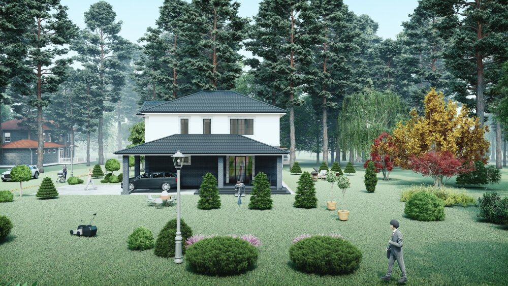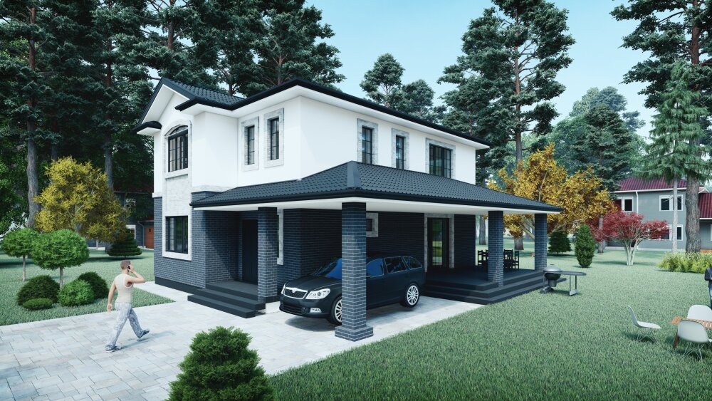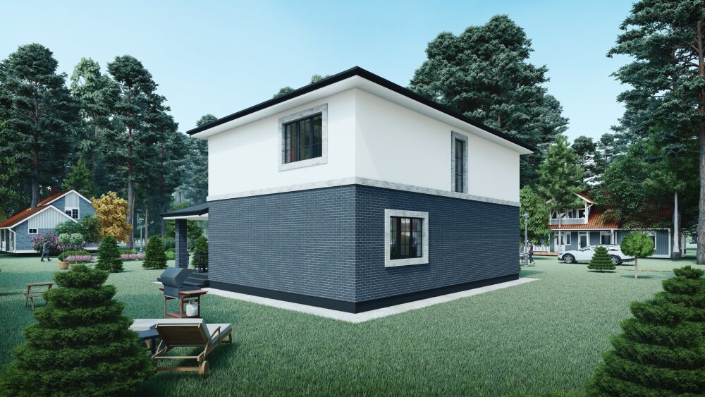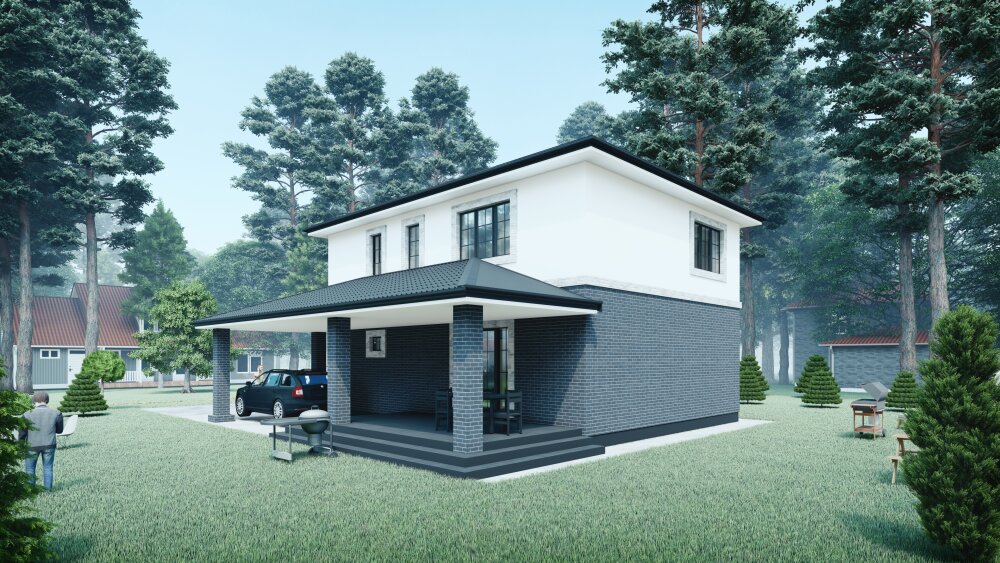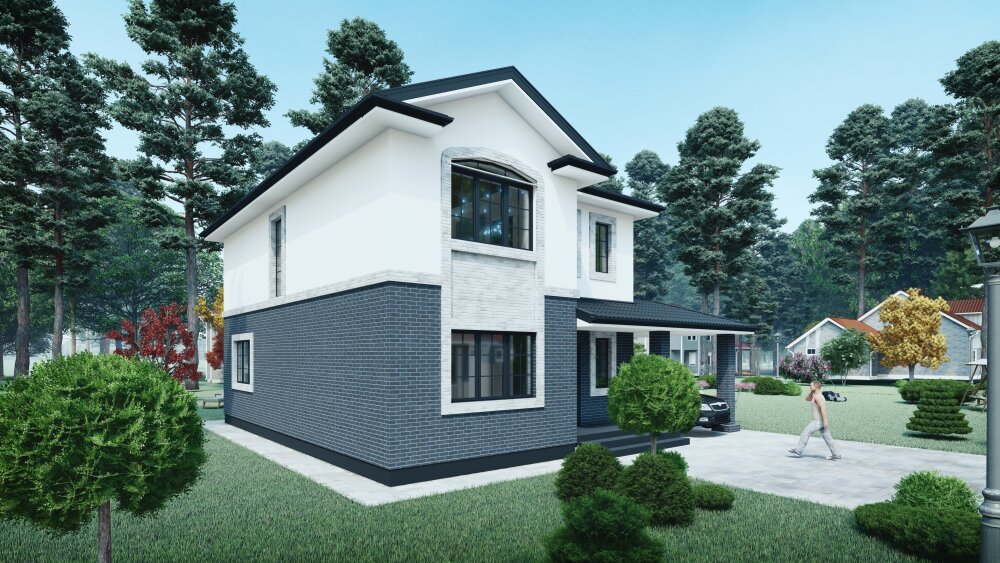 Компактный двухэтажный коттедж выполнен в современном стиле, сочетающем четкие геометрические формы и контрастную отделку. Акцент сделан на двухцветной композиции: первый этаж отделан массивной темно-серой кирпичной кладкой, что создает визуально прочное основание, в то время как второй этаж покрыт светлой штукатуркой для обеспечения «легкости». Дом имеет темную кровлю с минимальными свесами, а его фасады дополнены светлым обрамлением окон, что подчеркивает современную эстетику. Ключевым функциональным элементом является большая крытая зона перед входом, которая поддерживается массивными колоннами и может служить как просторный навес для автомобиля, так и уютная летняя терраса с местом для барбекю и отдыха.
