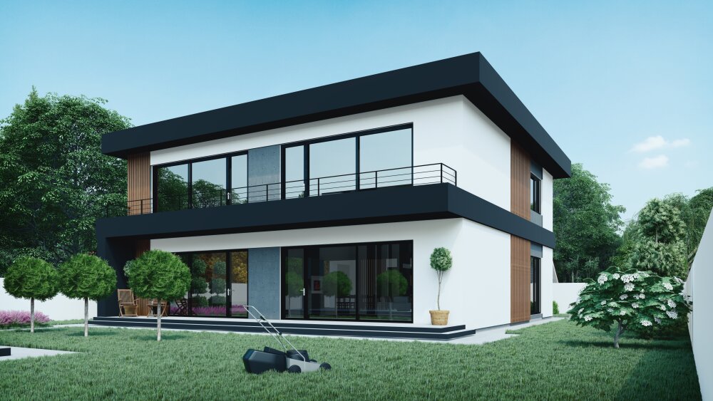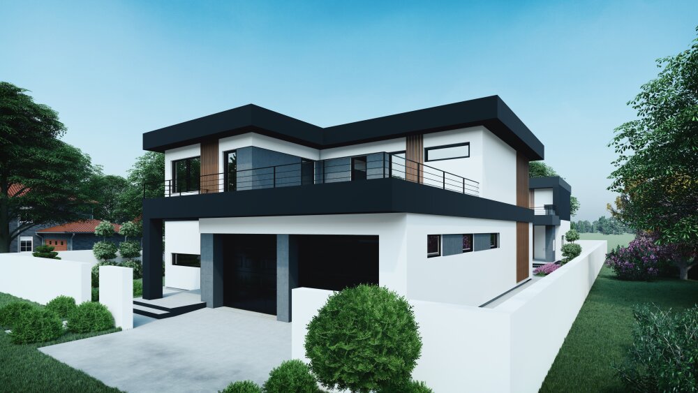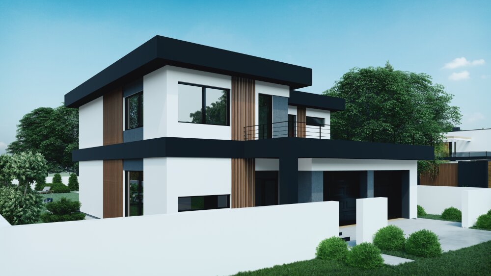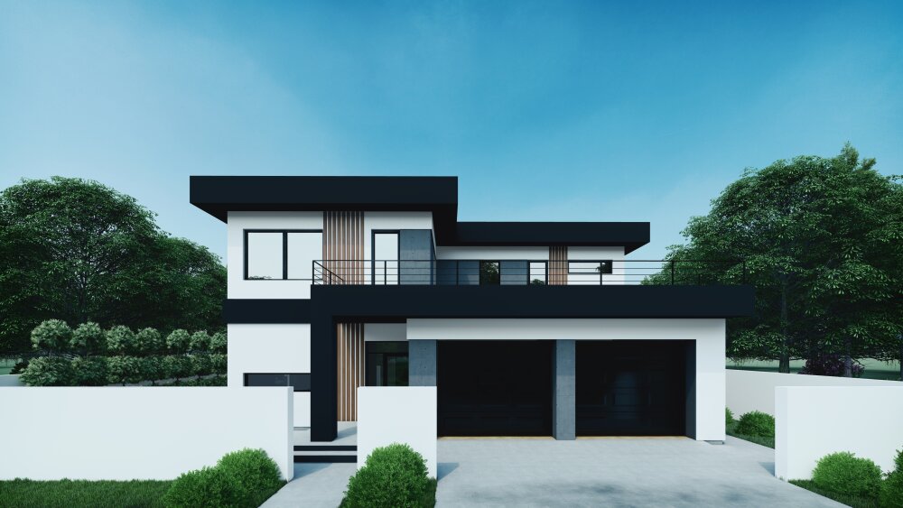 Современный двухэтажный коттедж с выразительными кубическими формами и плоской крышей. В основе дизайна лежит контрастная черно-белая палитра с добавлением теплой древесной текстуры. Фасады отделаны белой штукатуркой, которая контрастирует с массивными горизонтальными и вертикальными элементами темно-антрацитового цвета. Дополнительный акцент создают вертикальные вставки из деревянных ламелей, которые добавляют тепла и уюта. Дом отличается большой площадью остекления, что обеспечивает максимальное проникновение света и открывает виды на участок. Ключевые функциональные зоны включают интегрированный в объем дома гараж на два автомобиля на первом этаже и просторную открытую террасу на втором этаже, которая расположена над гаражом и имеет минималистичное металлическое ограждение.