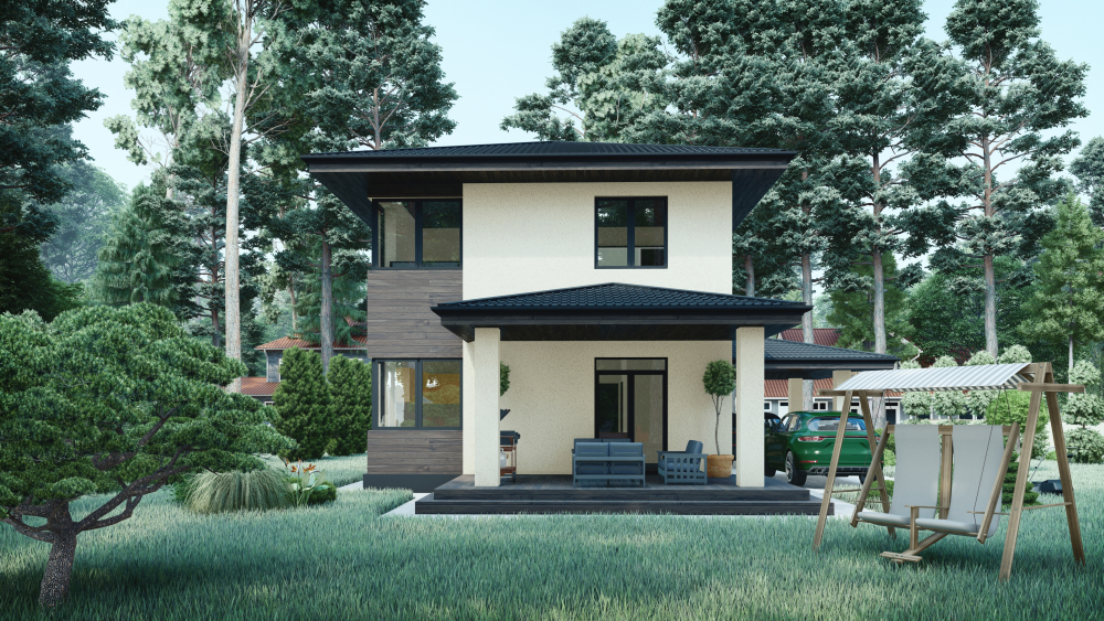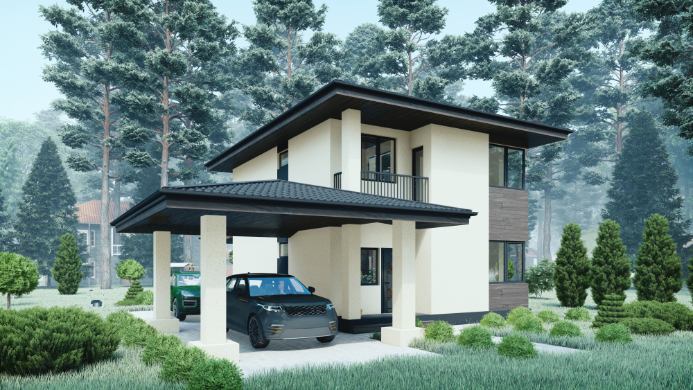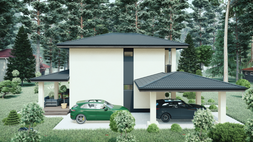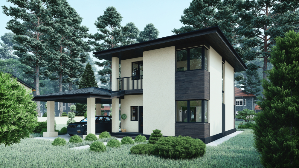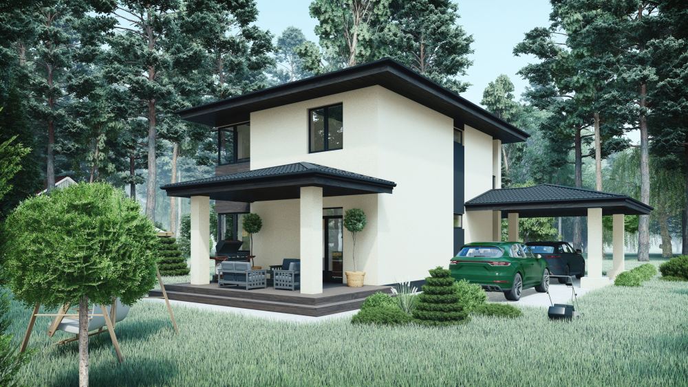 Двухэтажный коттедж, выполненный в современном стиле, гармонично сочетающем минимализм с элементами скандинавской эстетики. Дом имеет четкую прямоугольную форму с вальмовой четырехскатной крышей темно-серого цвета, имеющей выразительные, но сдержанные свесы. Основным материалом отделки фасадов является кремовая штукатурка. Контраст создается вертикальными акцентными вставками из темного горизонтального деревянного планкена. Ключевыми функциональными элементами являются два отдельных крытых навеса с крышей в тон основной: один – просторный навес для автомобиля, поддерживаемый светлыми колоннами, другой – крытая терраса для отдыха с деревянным настилом, прилегающая к гостиной. На втором этаже предусмотрен небольшой открытый балкон с минималистичным металлическим ограждением.