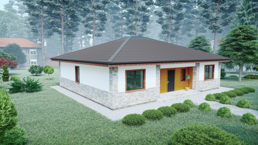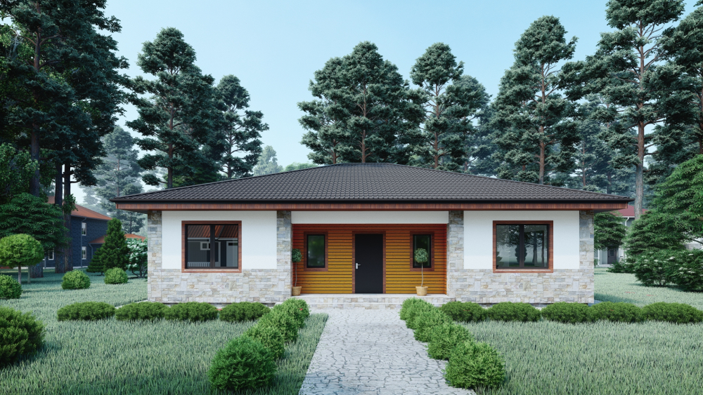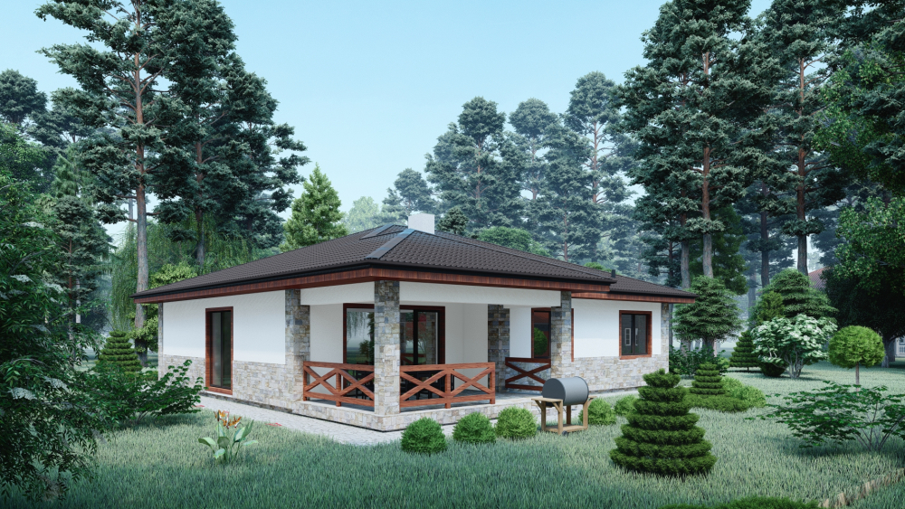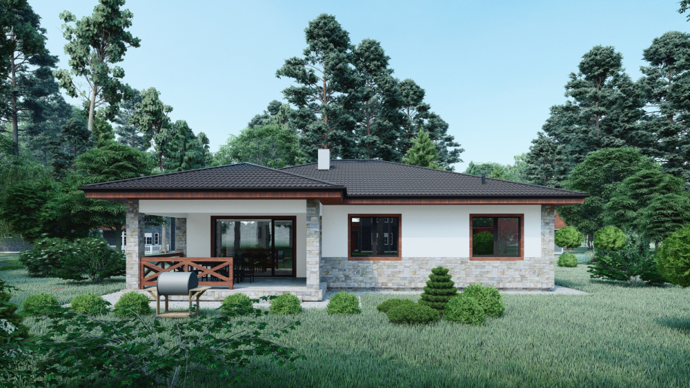 Современный одноэтажный дом, сочетающий в себе лаконичность и функциональность. Фасады отделаны светлой штукатуркой в комбинации с декоративным камнем, что придает зданию элегантный вид. Деревянные элементы добавляют тепло и уют. Четырехскатная крыша покрыта темной металлочерепицей, что создает приятный контраст. Главным акцентом является просторная крытая терраса с деревянным забором, идеально подходящим для обустройства летней столовой или зоны отдыха на свежем воздухе.