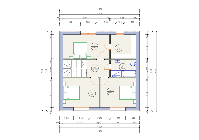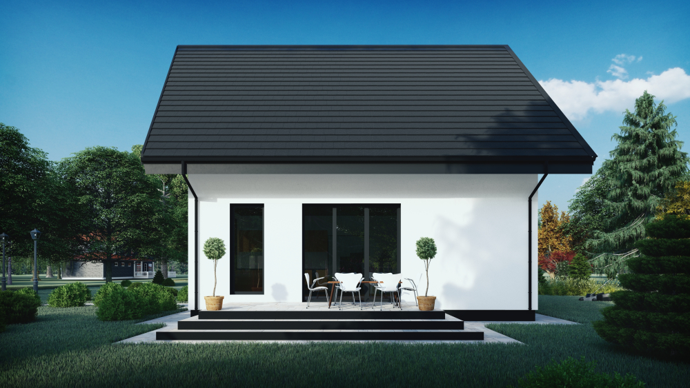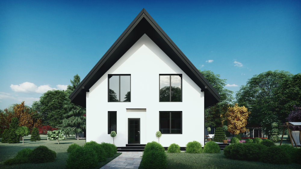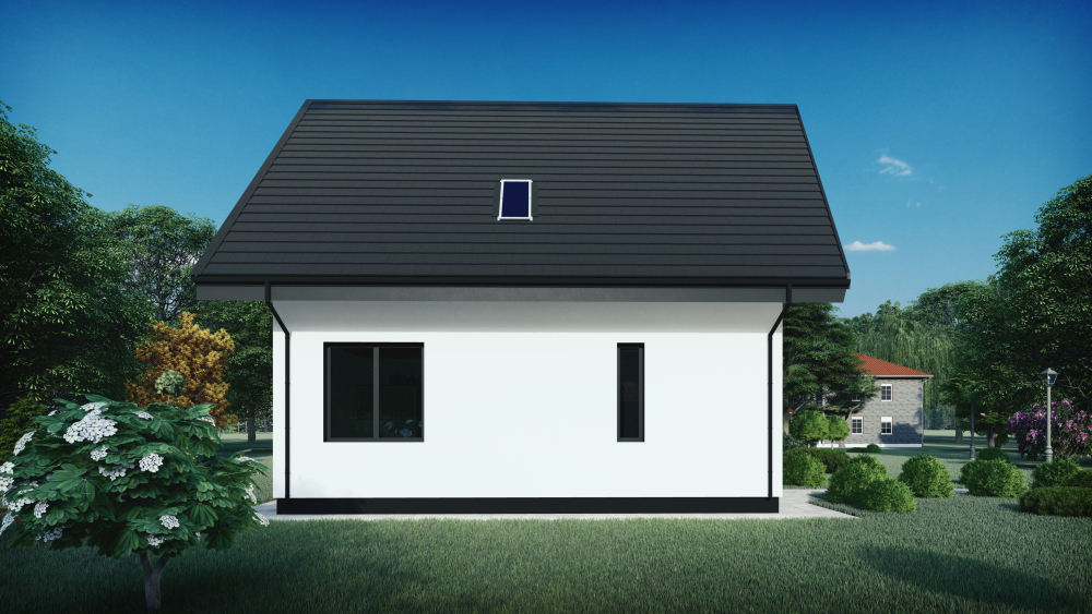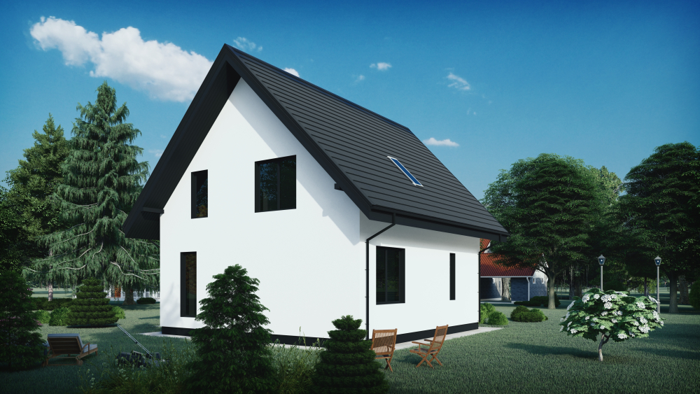 Стильный дом, имеющий простую прямоугольную форму, венчающую высокую двускатную крышу темного цвета, эффектно контрастирующую со светлыми оштукатуренными стенами. Большие окна на главном фасаде и мансардные окна на крыше обеспечивают отличное естественное освещение внутреннего пространства. Позади дома предусмотрена небольшая терраса для отдыха на открытом воздухе. Этот проект представляет собой воплощение современной функциональности, чистоты линий и форм.