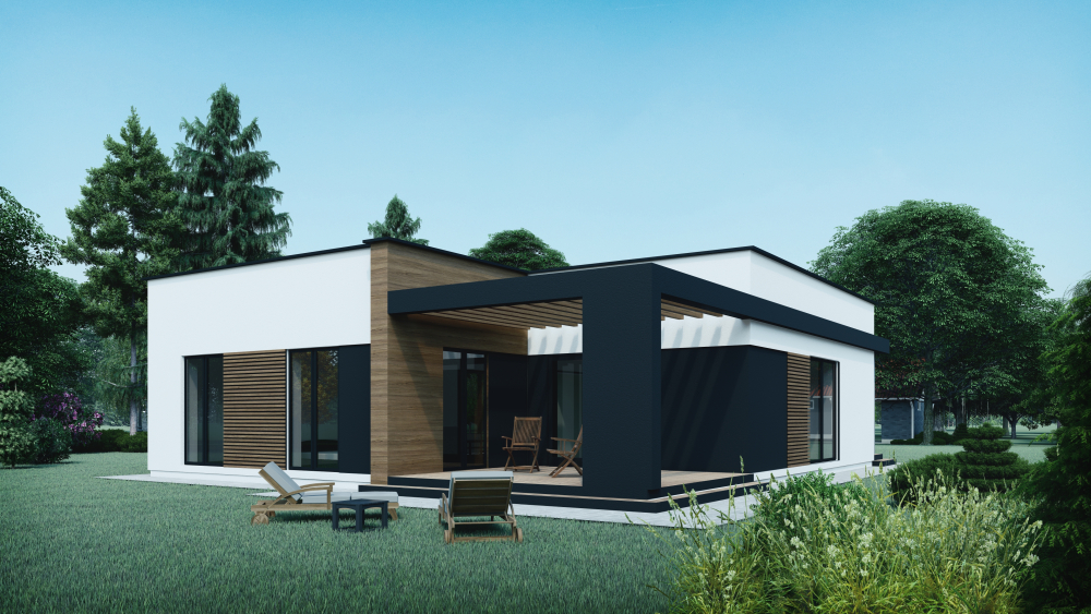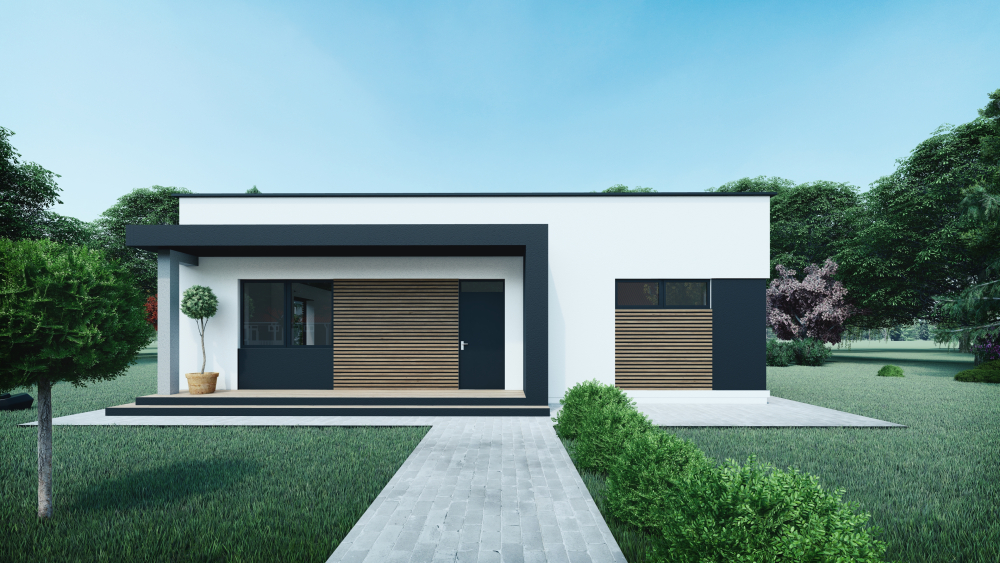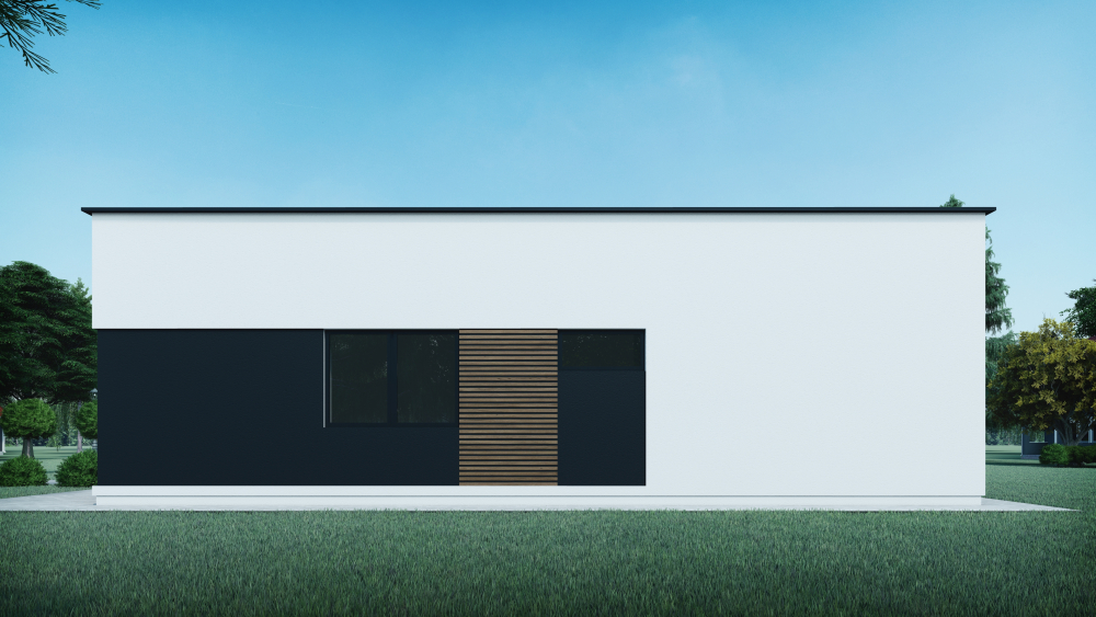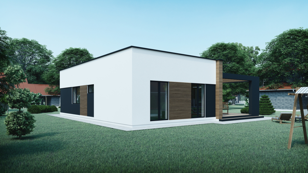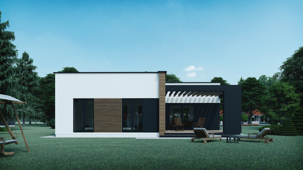 Современный одноэтажный дом с плоской крышей и геометрией фасадов. Акцент сделан на контрасте белого и графитового цвета, дополненного деревянными вставками. Большие панорамные окна обеспечивают максимальную естественную освещенность внутренних помещений. Украшением дома есть просторная терраса с перголой, идеально подходящая для зоны отдыха или летней столовой.
