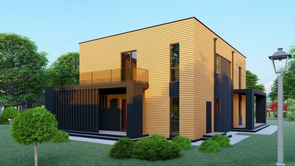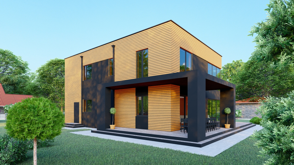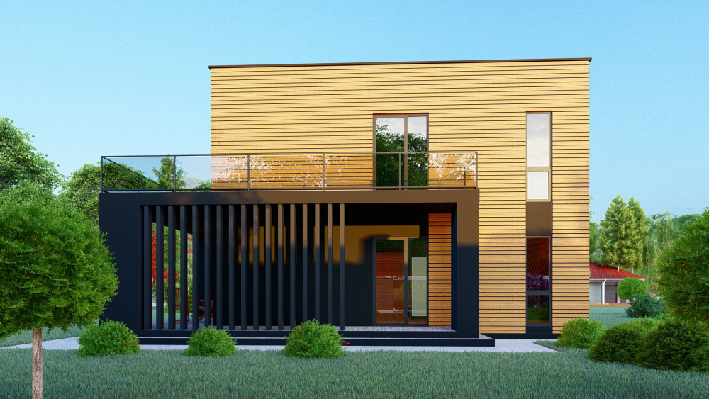 Современный двухэтажный коттедж с плоской крышей, сочетающий минималистичный дизайн и натуральные материалы. Фасады выполнены из деревянных панелей светлого оттенка, которые контрастируют с темными графитовыми элементами. Дом имеет большие панорамные окна, обеспечивающие максимальное освещение и открывающие прекрасные виды. На втором этаже расположен балкон со стеклянными ограждениями. На первом этаже предусмотрена просторная крытая терраса с деревянными ламелями, которые создают уютную тень, где можно организовать летнюю столовую или зону для отдыха.