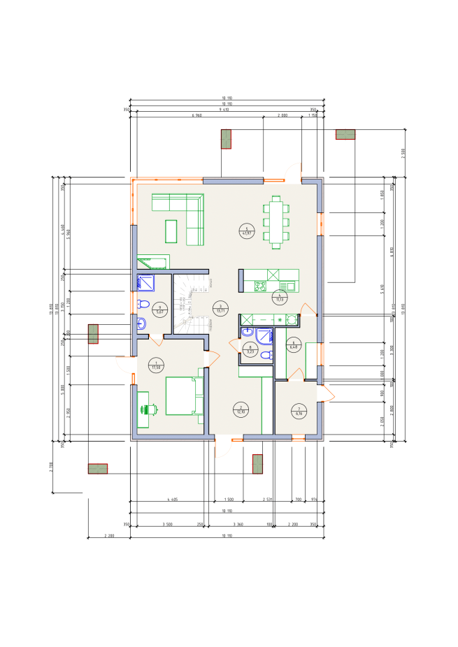 • Узлы - разрезы по стенам, устройство перемычки, коньковый гребень, примыкание к дымовой трубе, подшивка кровли, устройство деревянной обшивки, армирование террасы, опирание перегородок на плиту пола 1-го этажа, опирание внешней стены на фундамент.