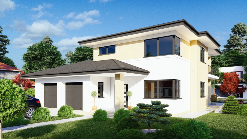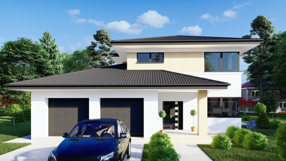 Большой двухэтажный дом с пологой крышей, широкими свесами и массивными колоннами. Фасад отделан в теплой бежево-белой гамме. Также дом имеет гараж на 2 машины.