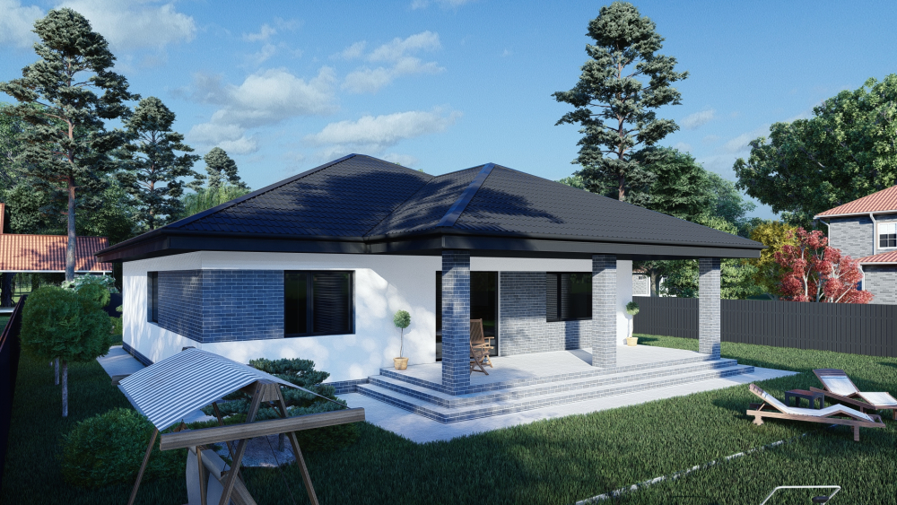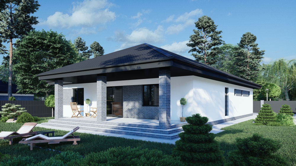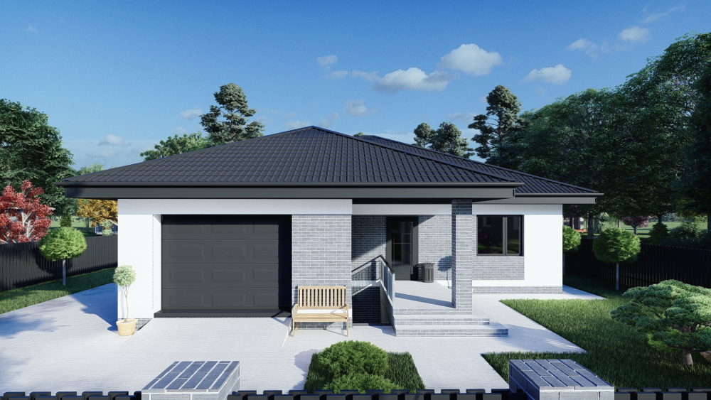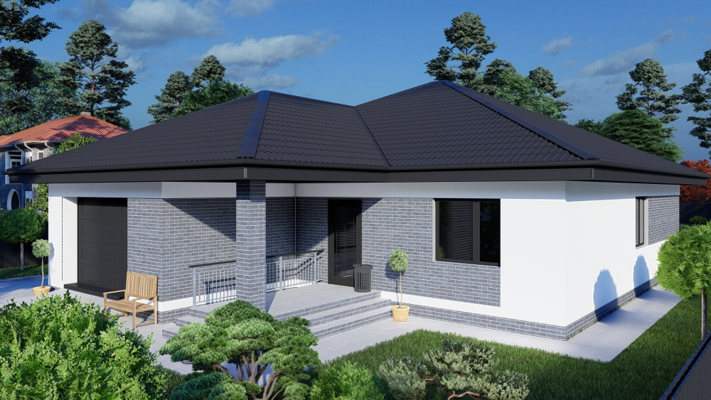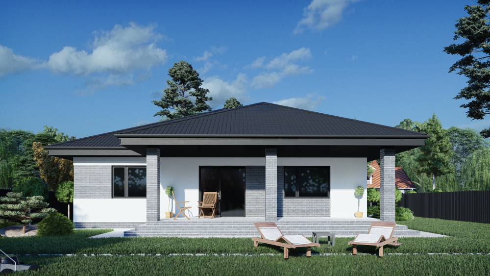 Классический одноэтажный дом со скатной крышей, сочетающий традиционную архитектуру и современный комфорт. Фасад отделан белой штукатуркой с акцентными вставками из серого клинкерного кирпича, что придает зданию строгий и элегантный вид. Также предусмотрен гараж и крытая терраса для отдыха на свежем воздухе.