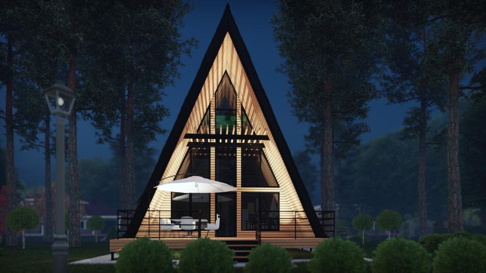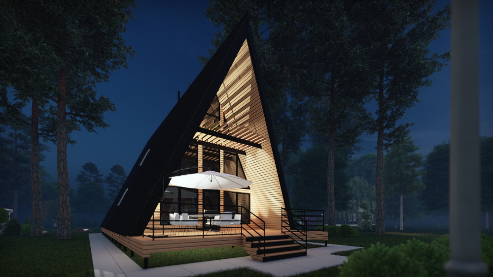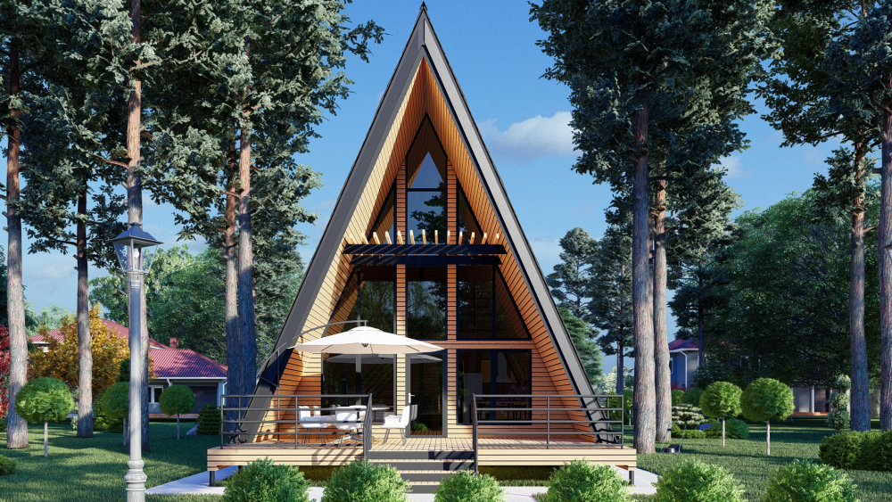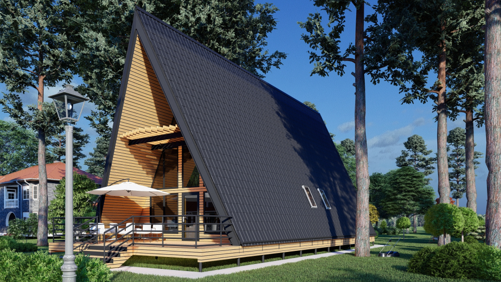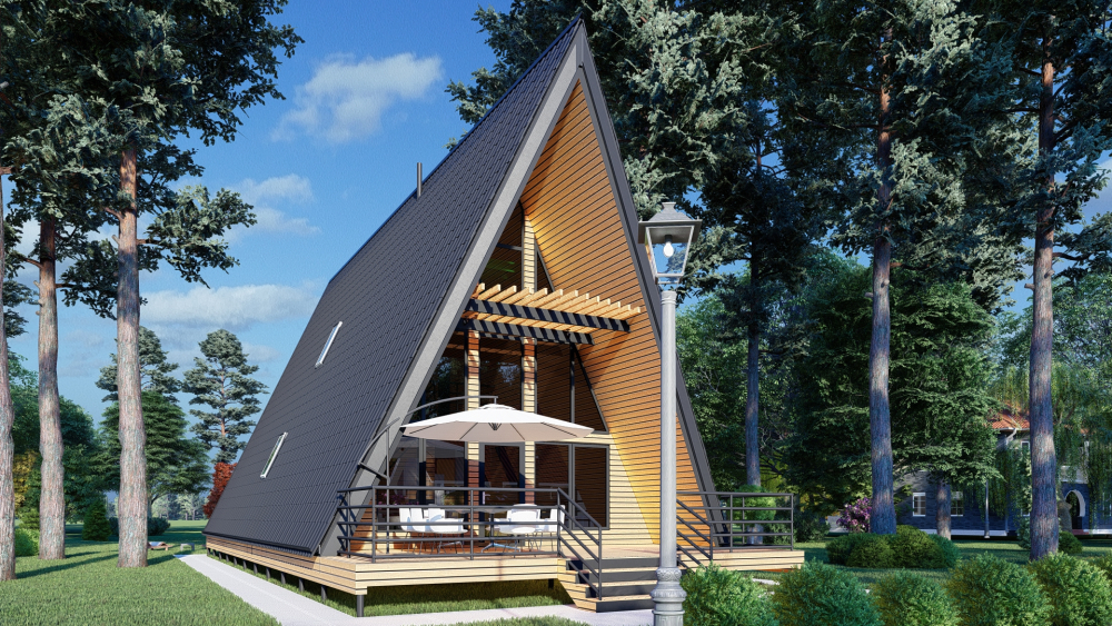 Уютный А-образный дом в современном стиле, идеально вписывающийся в природный ландшафт. Характерной чертой является высокая островерхая крыша, спускающаяся почти до земли и выполняющая также функцию стен. Фасад имеет панорамное остекление на всю высоту фронтона, что обеспечивает максимальное естественное освещение и прекрасный вид из окон. Планировка продумана до мелочей: первый этаж включает просторную гостиную с кухней и две спальни, а на втором этаже расположена еще одна спальня с выходом на балкон.