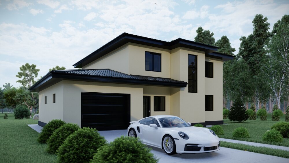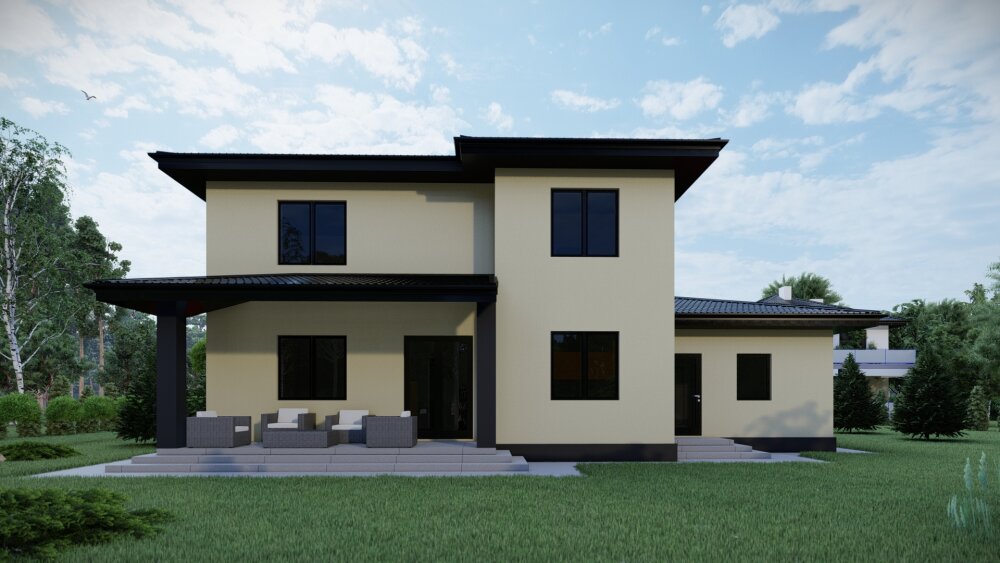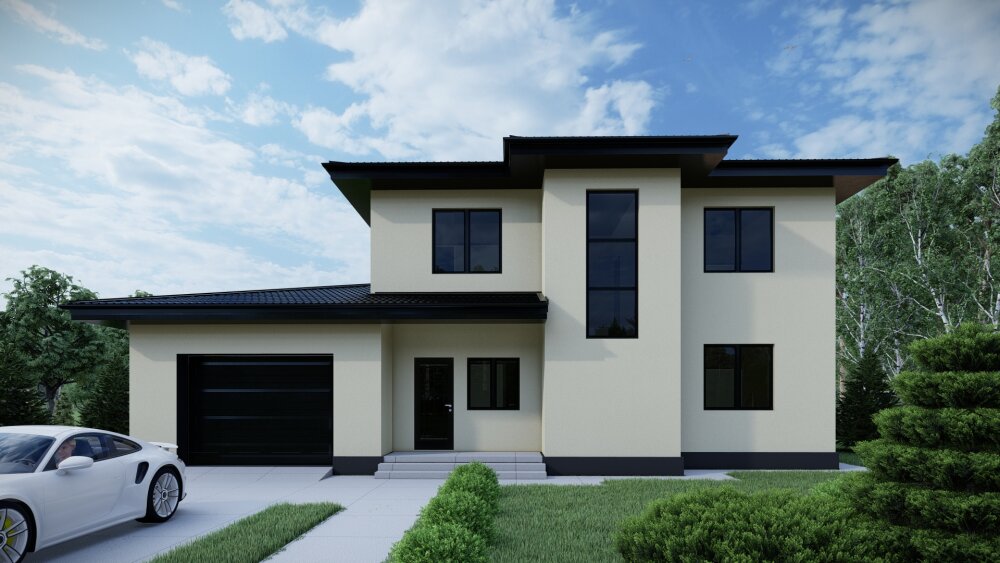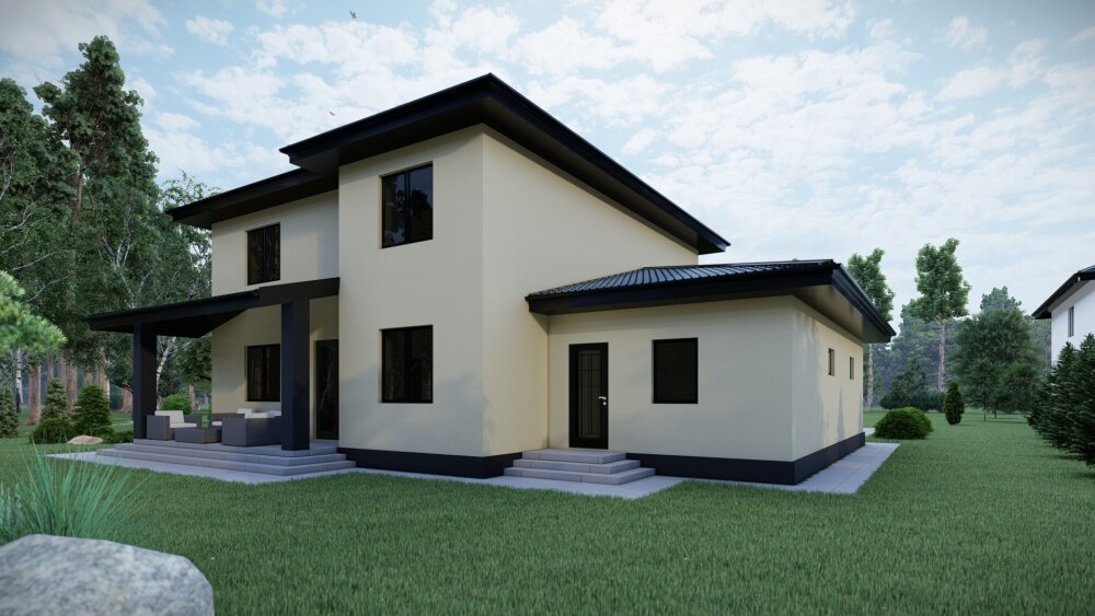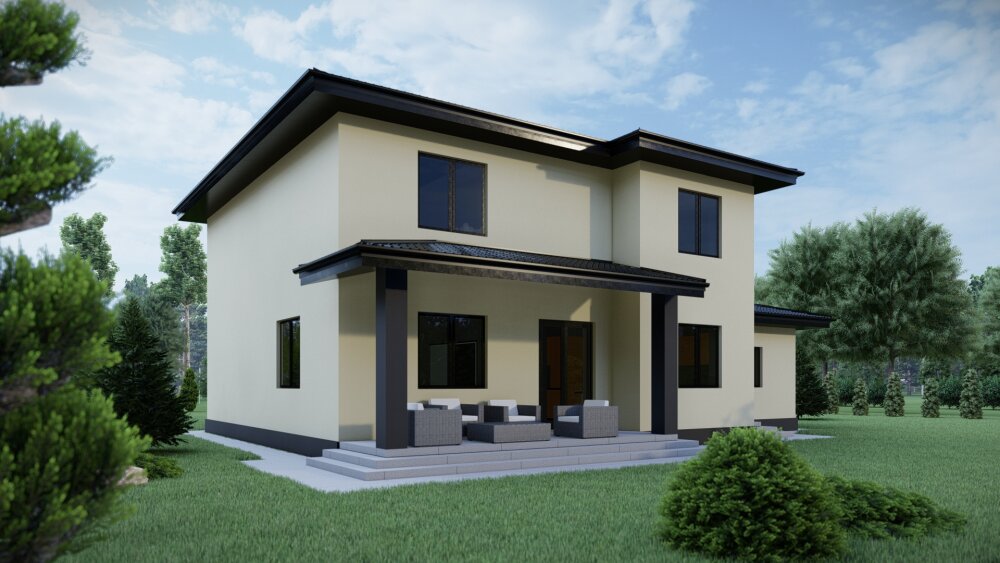 Просторный двухэтажный дом в классическом стиле с многоскатной крышей. Фасад отделан светлой штукатуркой, гармонично контрастирующей с темной кровлей и оконными рамами. Дом идеально подходит для большой семьи, предлагая четыре полноценные спальни. Планировка обеспечивает высокий уровень комфорта благодаря наличию гардеробных и нескольких санузлов.