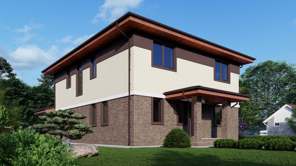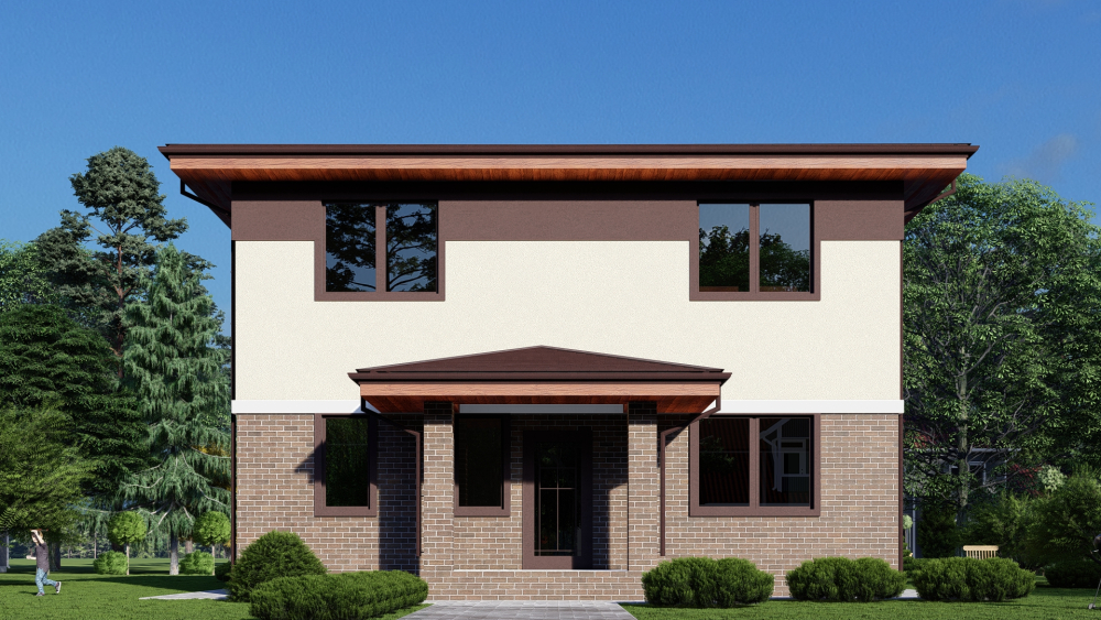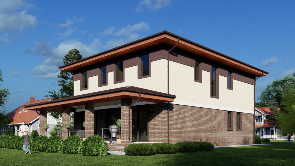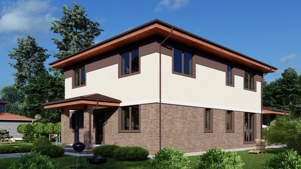 Элегантный двухэтажный дом в классическом стиле с гармоничным сочетанием материалов на фасаде. Первый этаж отделан темным клинкерным кирпичом, придающим зданию основательность, тогда как второй этаж выполнен в светлой штукатурке, добавляя легкости. Четырехскатная крыша с широкими свесами подчеркивает традиционный характер архитектуры. Планировка идеально подходит для большой семьи.