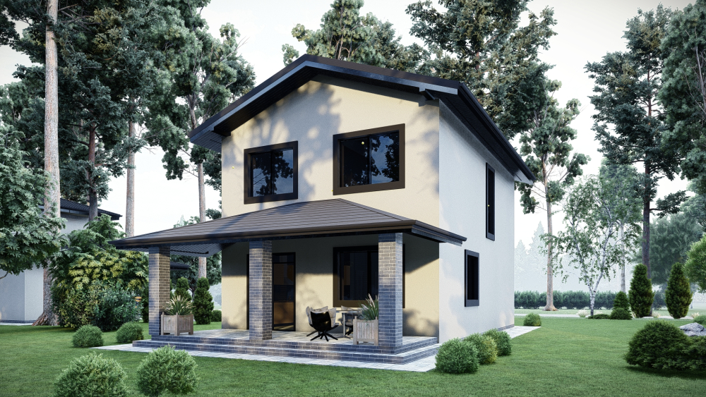 Компактный и функциональный двухэтажный дом с классической двускатной крышей. Фасад отделан светлой штукатуркой с акцентными вставками из серого декоративного кирпича на углах и входной группе, что придает зданию современный вид.