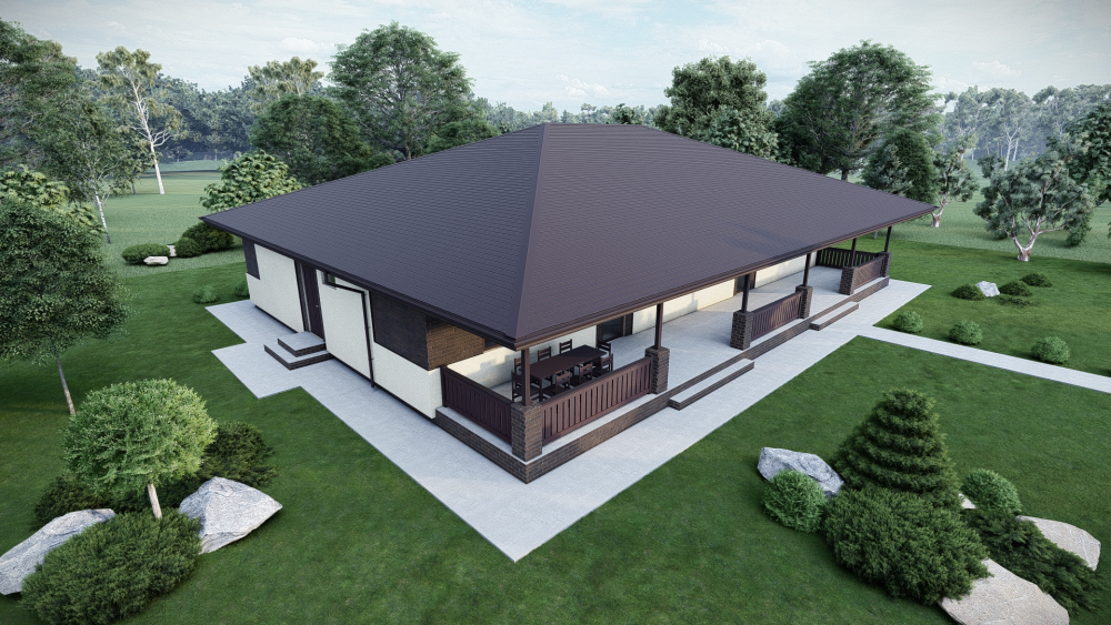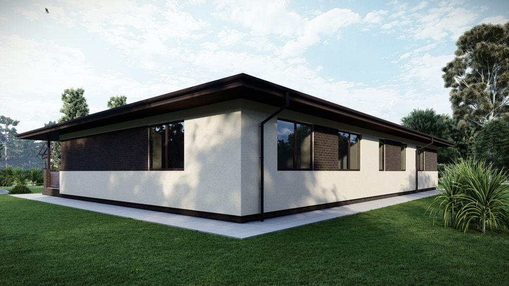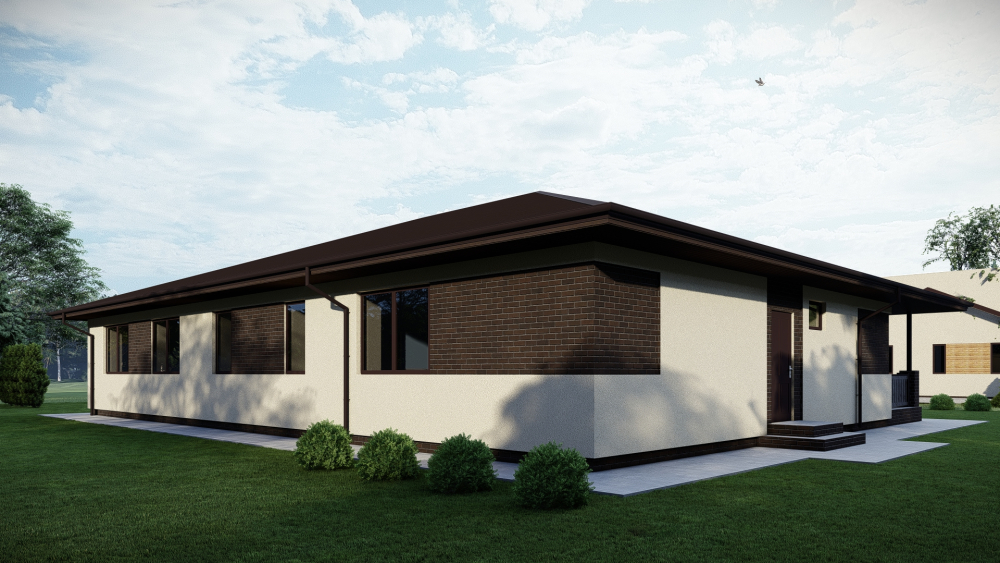 Одноэтажный дом в классическом стиле с низкой четырехскатной крышей. Фасадная отделка сочетает светлую штукатурку с массивной обшивкой серой клинкерной плиткой в нижней части, что придает зданию солидность. Дом не имеет встроенного гаража, однако оснащен большими панорамными окнами и крытыми террасами.