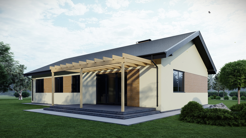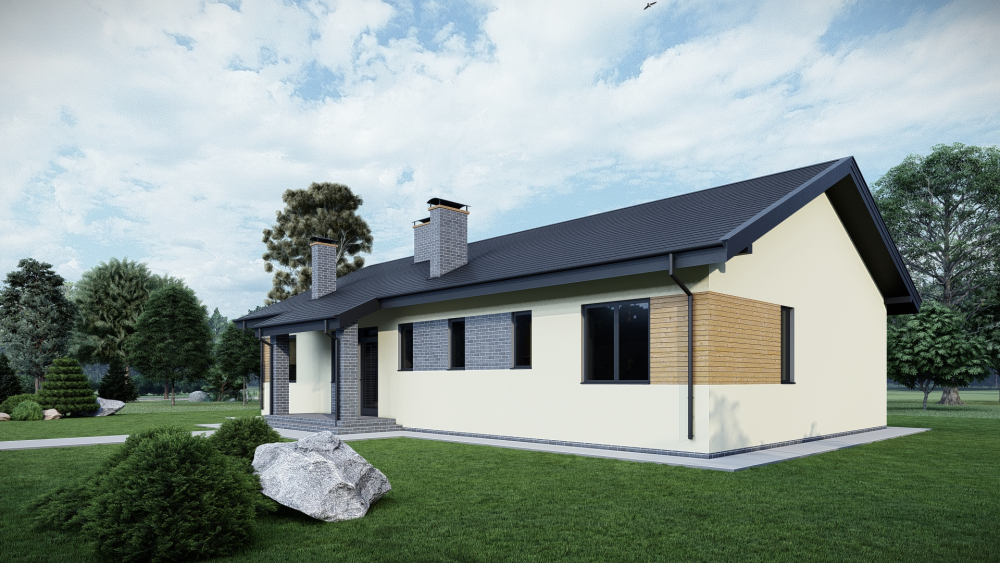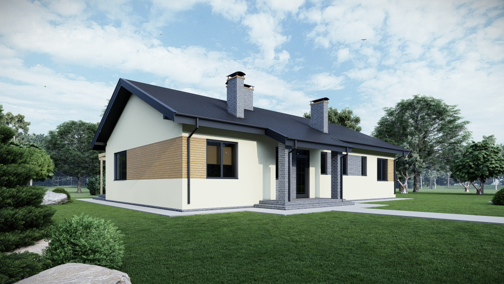 Просторный одноэтажный дом с классической двускатной крышей, сочетающий традиционные формы и современные отделочные материалы. Фасад выполнен в светлой штукатурке с акцентными вставками из дерева и серого декоративного кирпича, что придает зданию выразительность. Планировка рассчитана на комфортное проживание семьи. Украшением дома является большая крытая терраса, которая служит идеальным местом для отдыха.