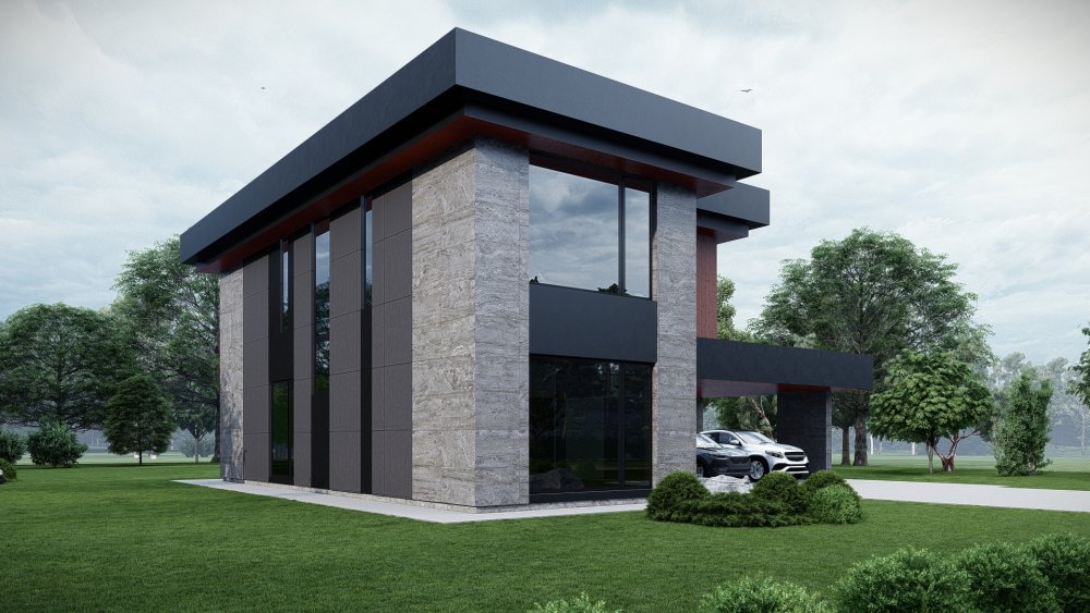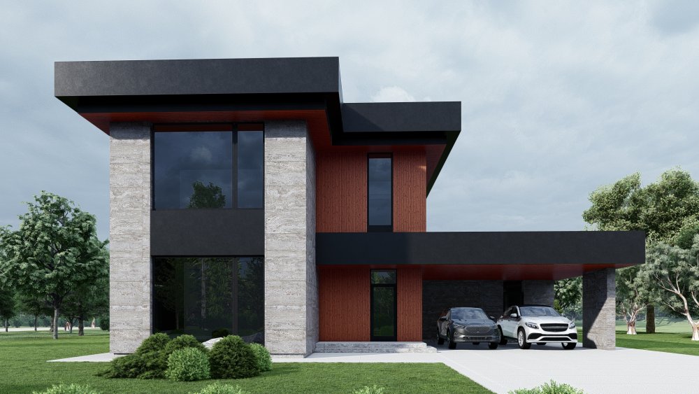 Современный двухэтажный дом с плоской крышей и большим навесом для двух автомобилей. Фасад украшен комбинацией фактурной плитки под бетон и теплого дерева, что создает эффектный и стильный вид. Проект отличается уникальной планировкой, где основная жилая зона расположена на первом этаже, а на втором этаже находится спальная зона с тремя дополнительными комнатами. Это идеальное решение для большой семьи, ценящей пространство и приватность.