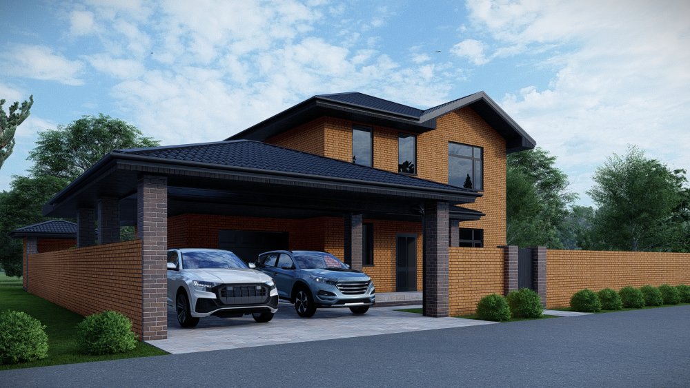 Современный двухэтажный дом в стиле хай-тек с многоскатной крышей и большим навесом для двух автомобилей. Фасад отделан комбинацией фактурной плитки под камень и теплого дерева, что создает эффектный и стильный вид. Это идеальное решение для большой семьи, ценящей пространство и приватность.
