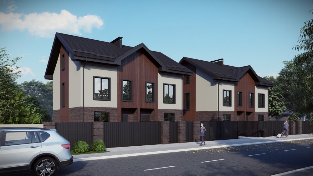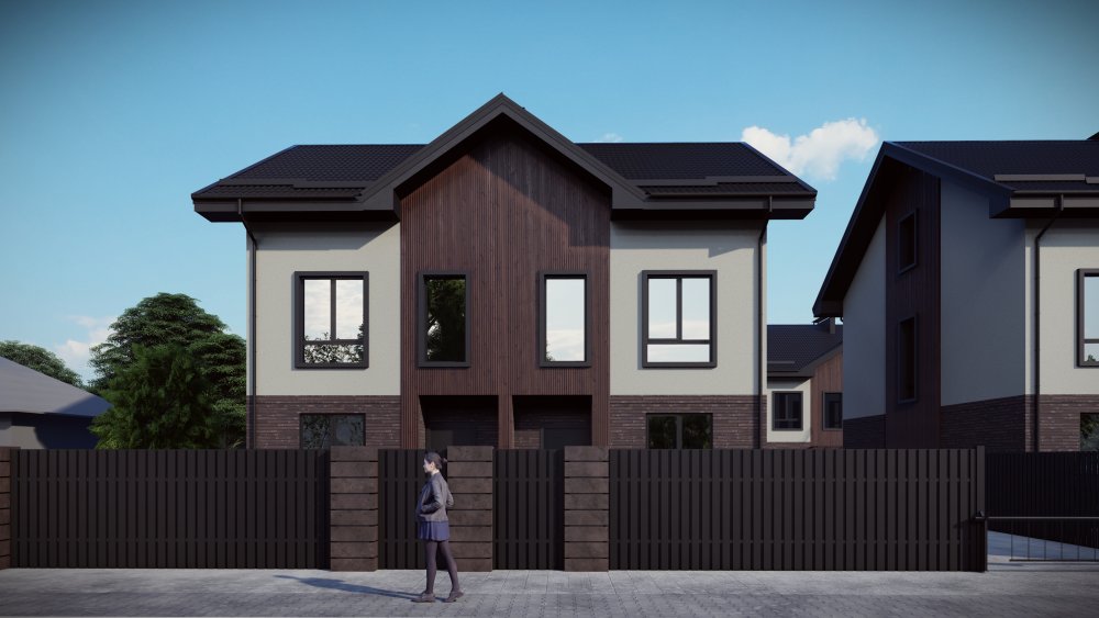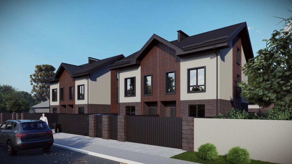 Компактный двухэтажный таунхаус в классическом стиле. Фасад сочетает кирпичную кладку в нижней части, светлую штукатурку и деревянные акценты на фронтонах. Рациональная, вертикально ориентированная архитектура позволила разместить четыре спальни и два санузла на небольшой площади.