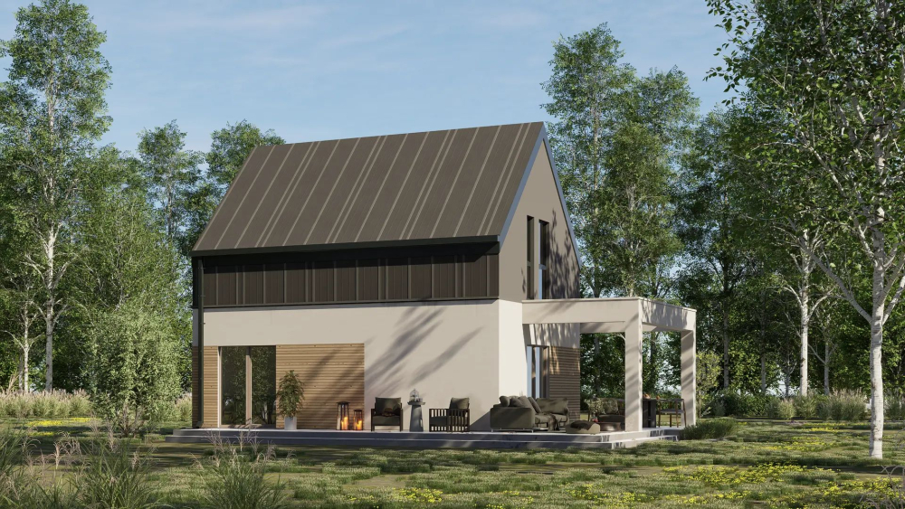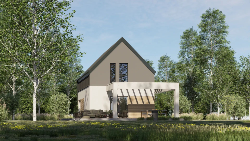 Современный двухэтажный дом с четким горизонтальным зонированием. Первый этаж выполнен из светлой штукатурки. Второй этаж и высокая двускатная крыша визуально объединены в единый темный объем. Ключевой акцент — просторная угловая терраса, примыкающая к первому этажу и имеющая белую перголу, которая создает защиту от солнца и плавный переход к открытому пространству.