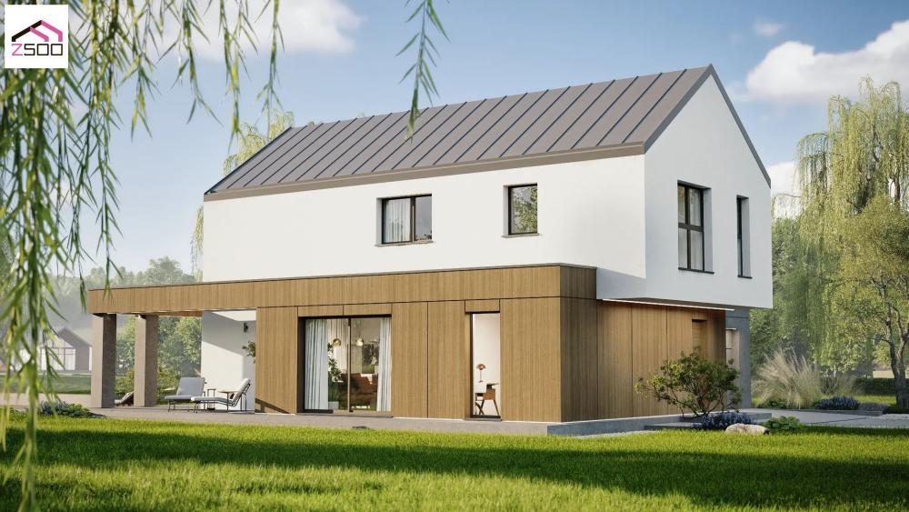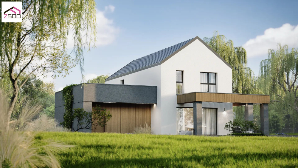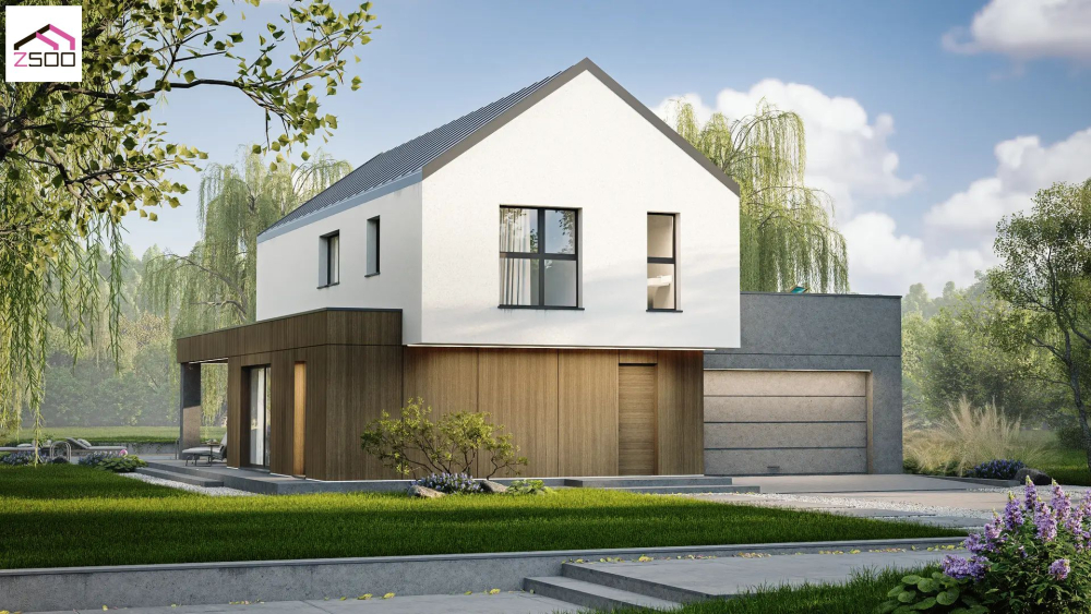 Современный двухэтажный коттедж, гармонично сочетающий минималистичный дизайн и традиционные формы. Основной объем дома выполнен в светлой штукатурке со скатной крышей, покрытой темной металлочерепицей. Первый этаж визуально расширен за счет использования деревянных панелей теплого оттенка и темных серых элементов, что создает интересный контраст. Большие окна обеспечивают превосходное естественное освещение. Предусмотрена просторная крытая терраса, интегрированная в архитектуру дома, где можно обустроить зону отдыха. Дополнительно есть интегрированный гараж.