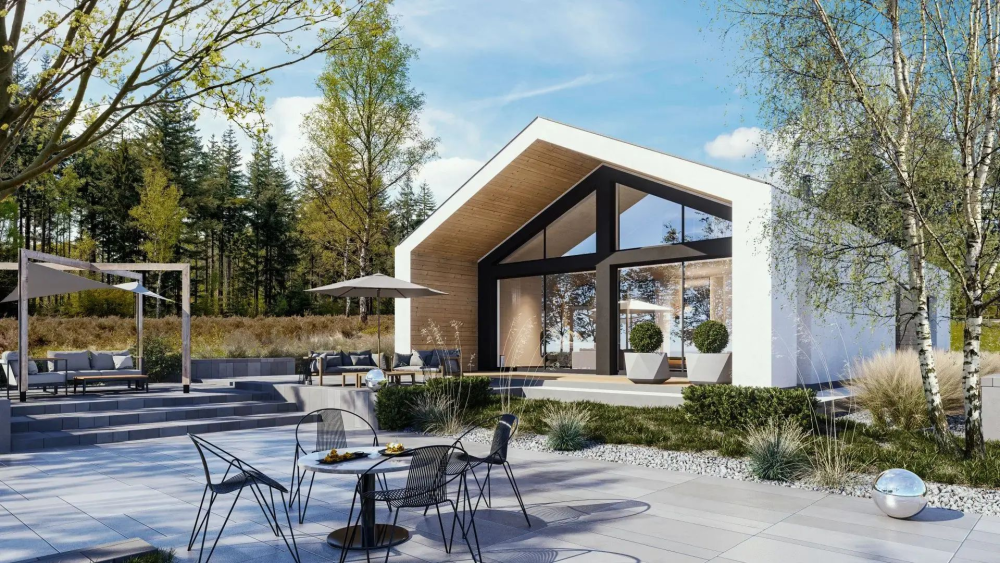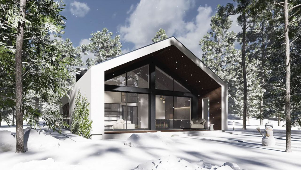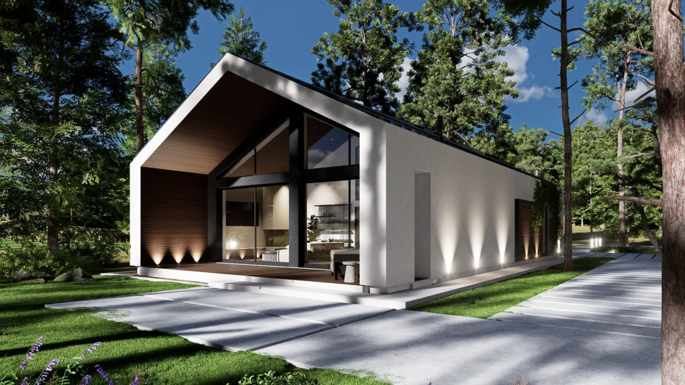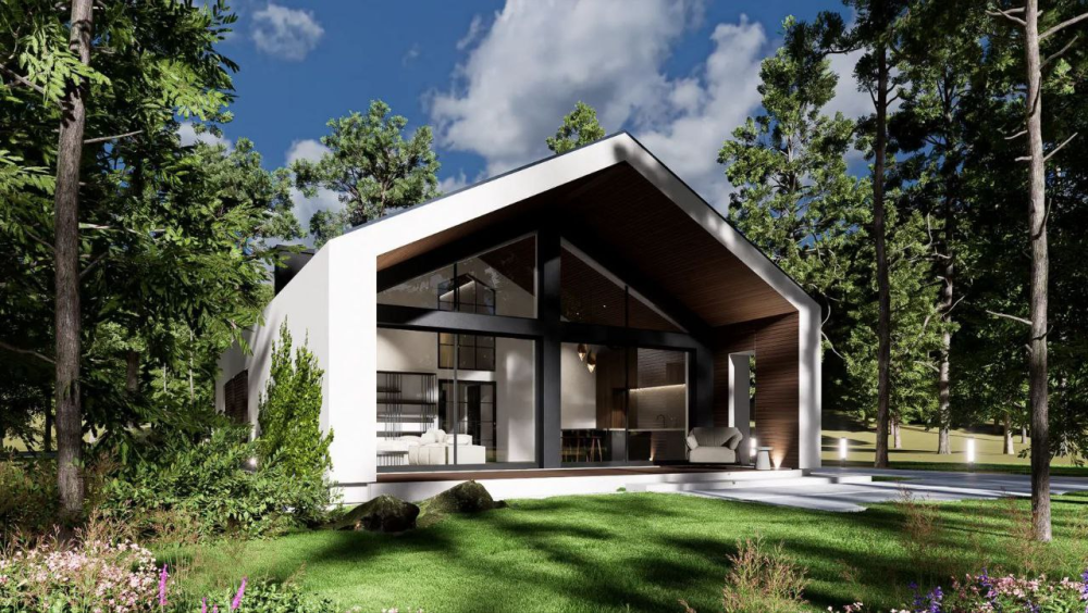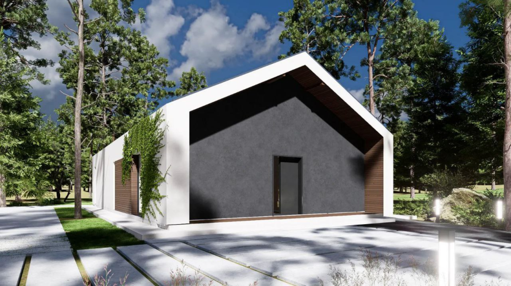 Стильный одноэтажный коттедж, выполненный в минималистичном стиле. Боковые фасады дома светлого оттенка. Архитектурный акцент создает высокая двускатная крыша с темной металлической кровлей и глубоко утопленный главный фасад. Он полностью остеклен панорамными окнами, открывая интерьер наружу, а пространство под навесом превращается в уютную крытую террасу.