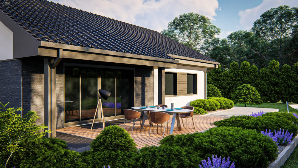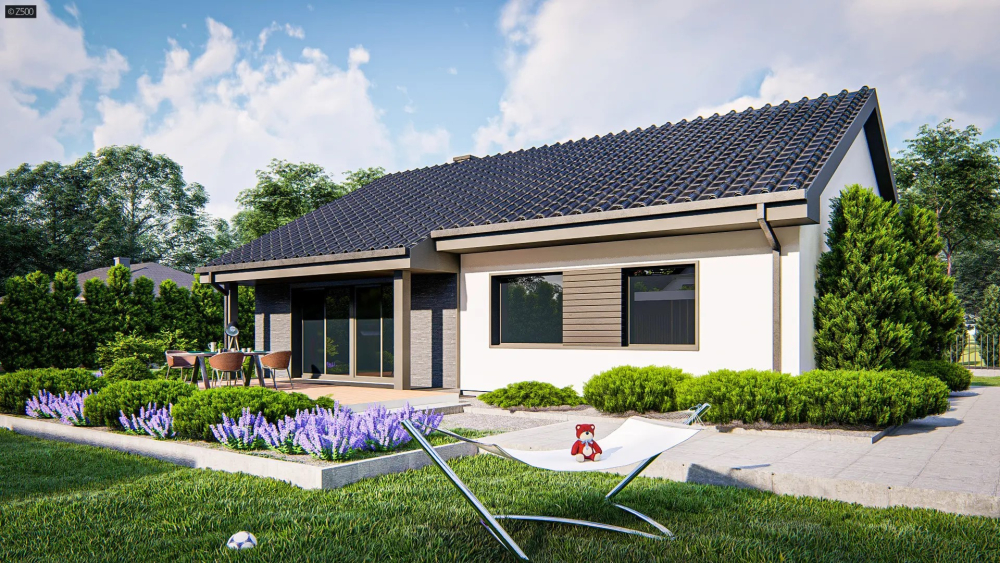 Конструктивно дом прост в реализации - одноэтажная форма и двускатная крыша позволяют возводить здание быстро и с меньшими затратами на материалы.
