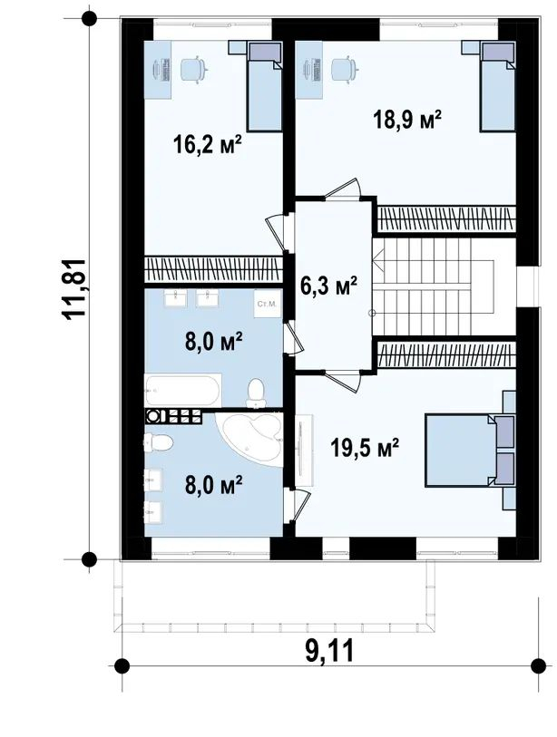 Этот проект идеально подойдёт для семьи, которая ценит комфорт, стиль и современные решения. В данной версии предусмотрено плитное межэтажное перекрытие. Также доступна версия с монолитным перекрытием и множество вариантов с различными изменениями в планировке.