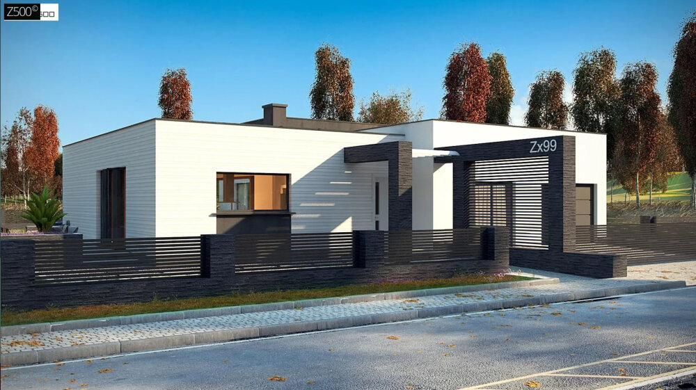 Проект Ux99 v1 - это современный одноэтажный дом с плоской крышей, сочетающий минимализм, функциональность и комфорт. Чёткие линии фасада, большие панорамные окна, сочетание светлых и тёмных материалов создают стильный внешний облик.